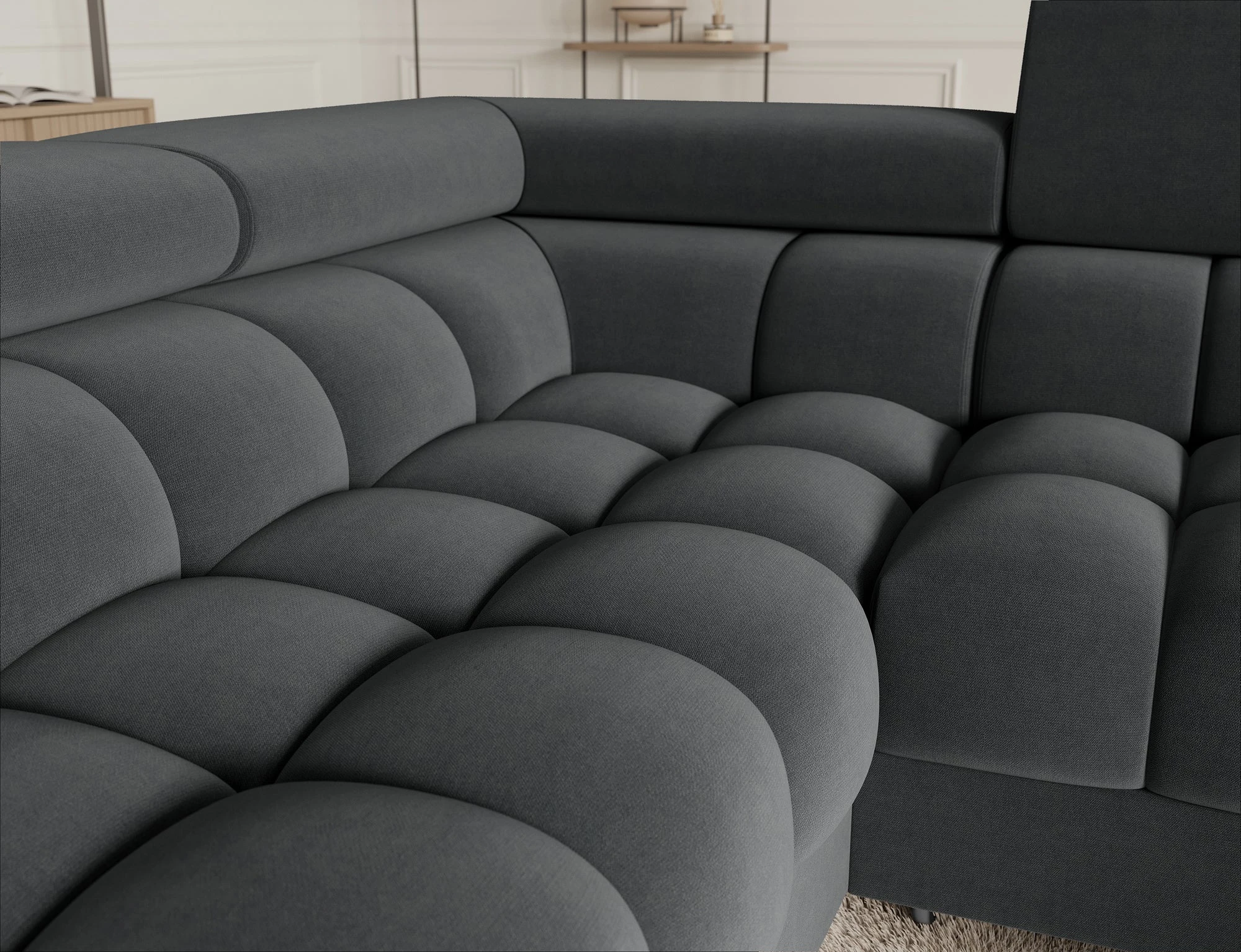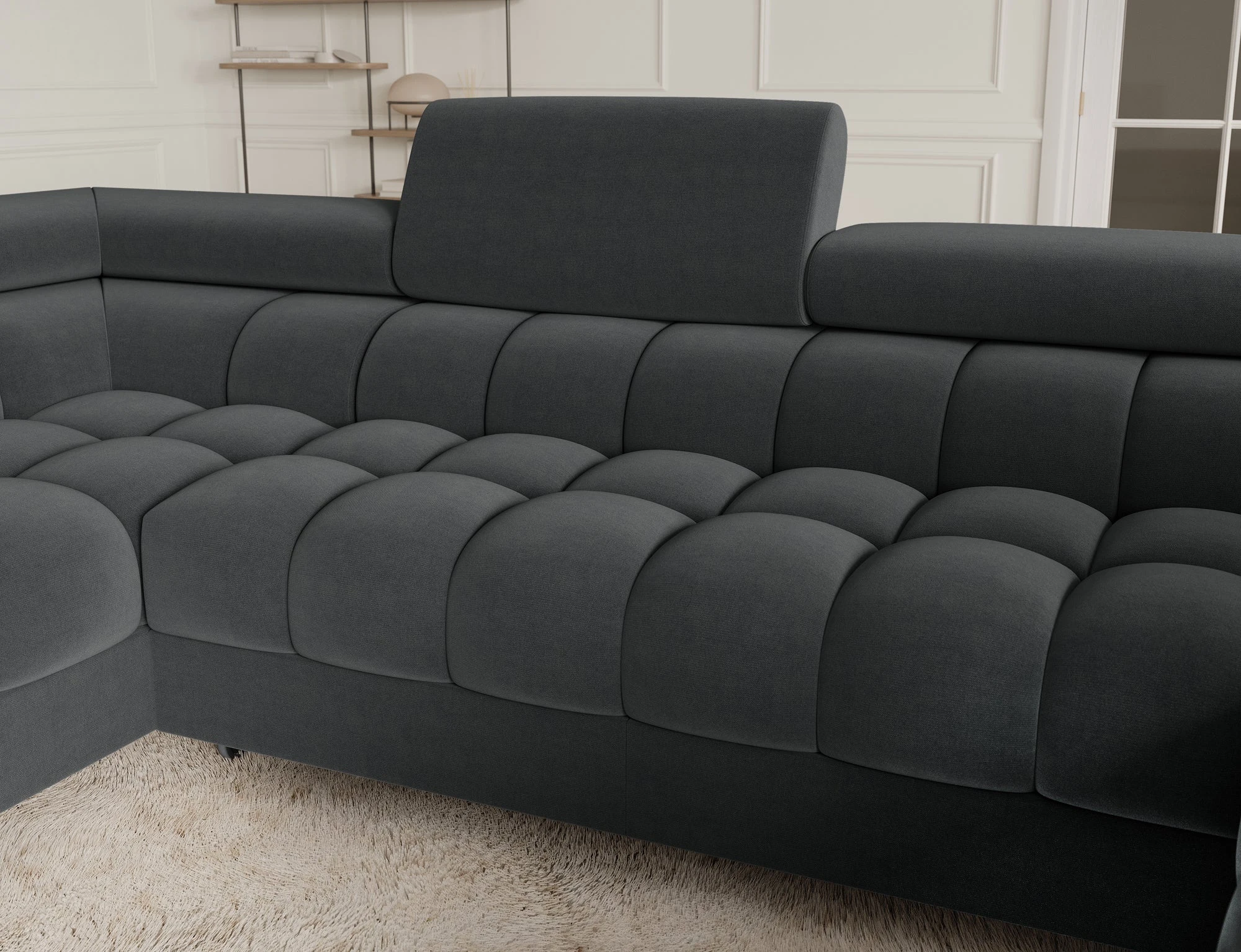 Narożnik FECTORY Tkanina Sola 06 Grafitowy Pojemnik Funkcja Spania Regulowane Zagłówki Nowoczesny