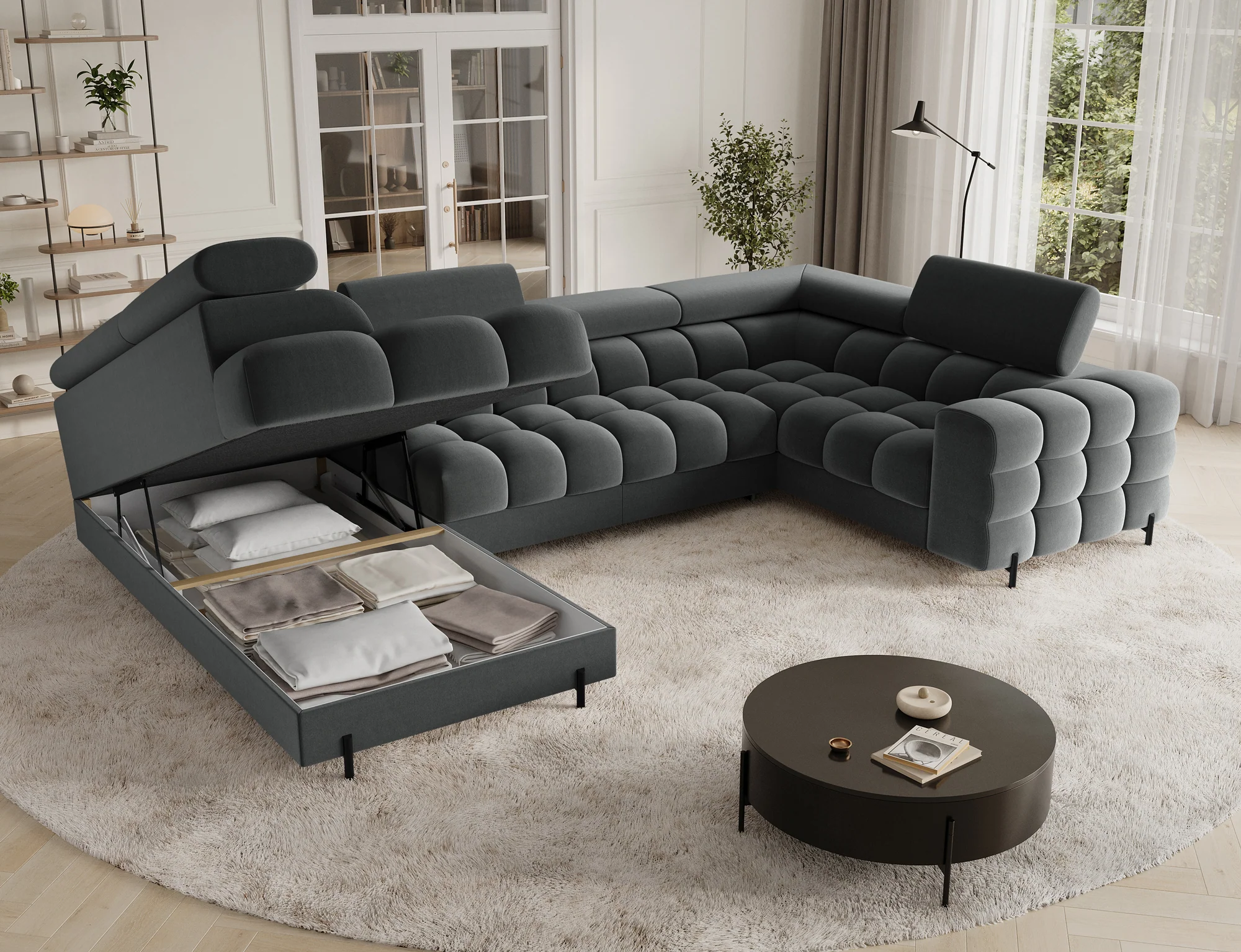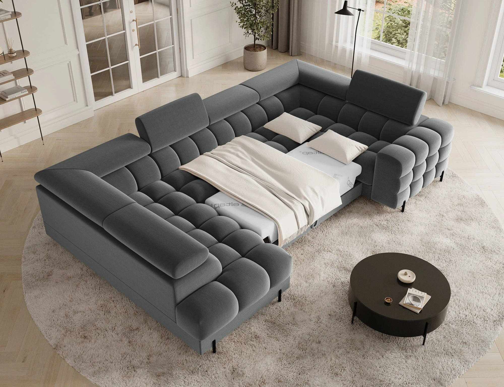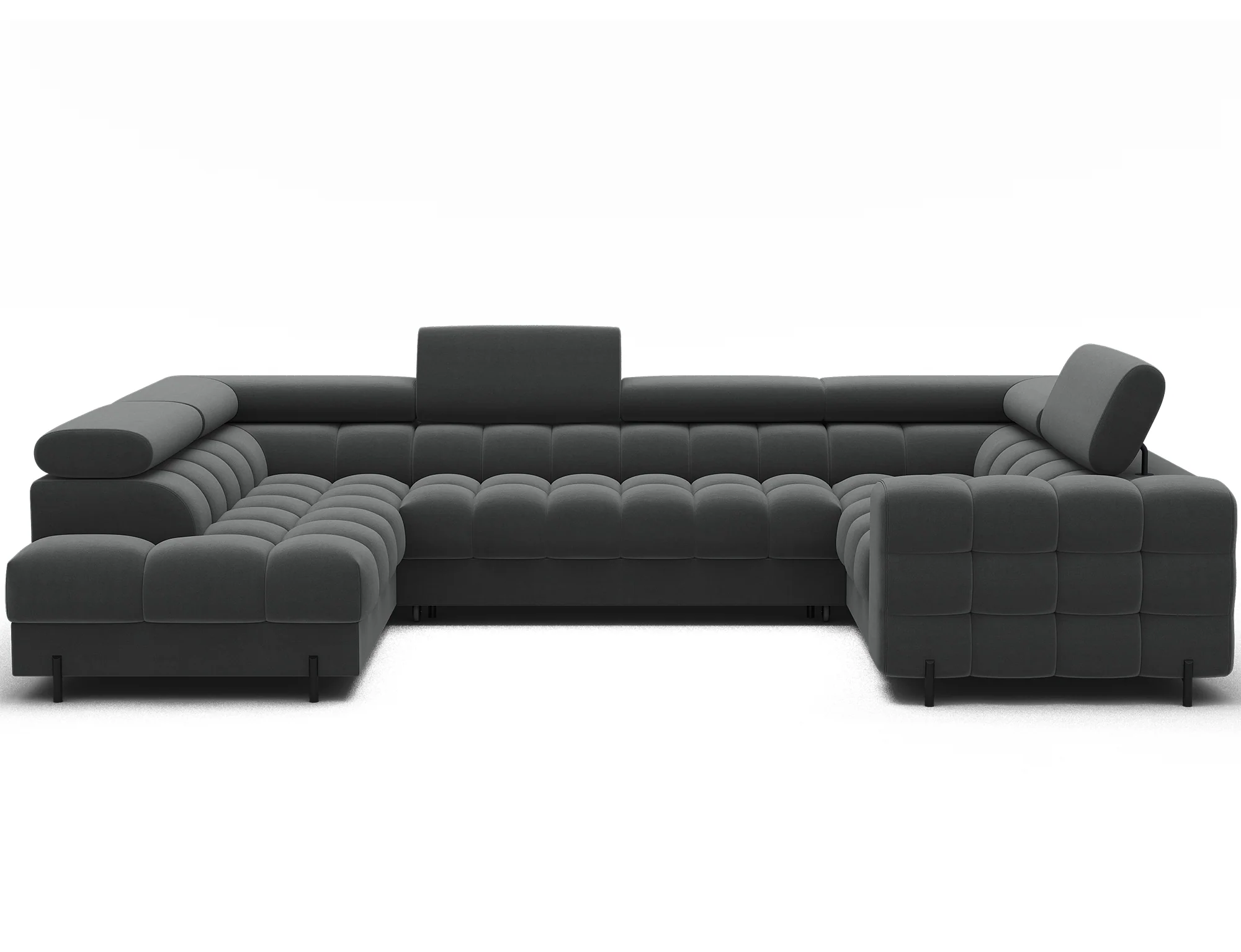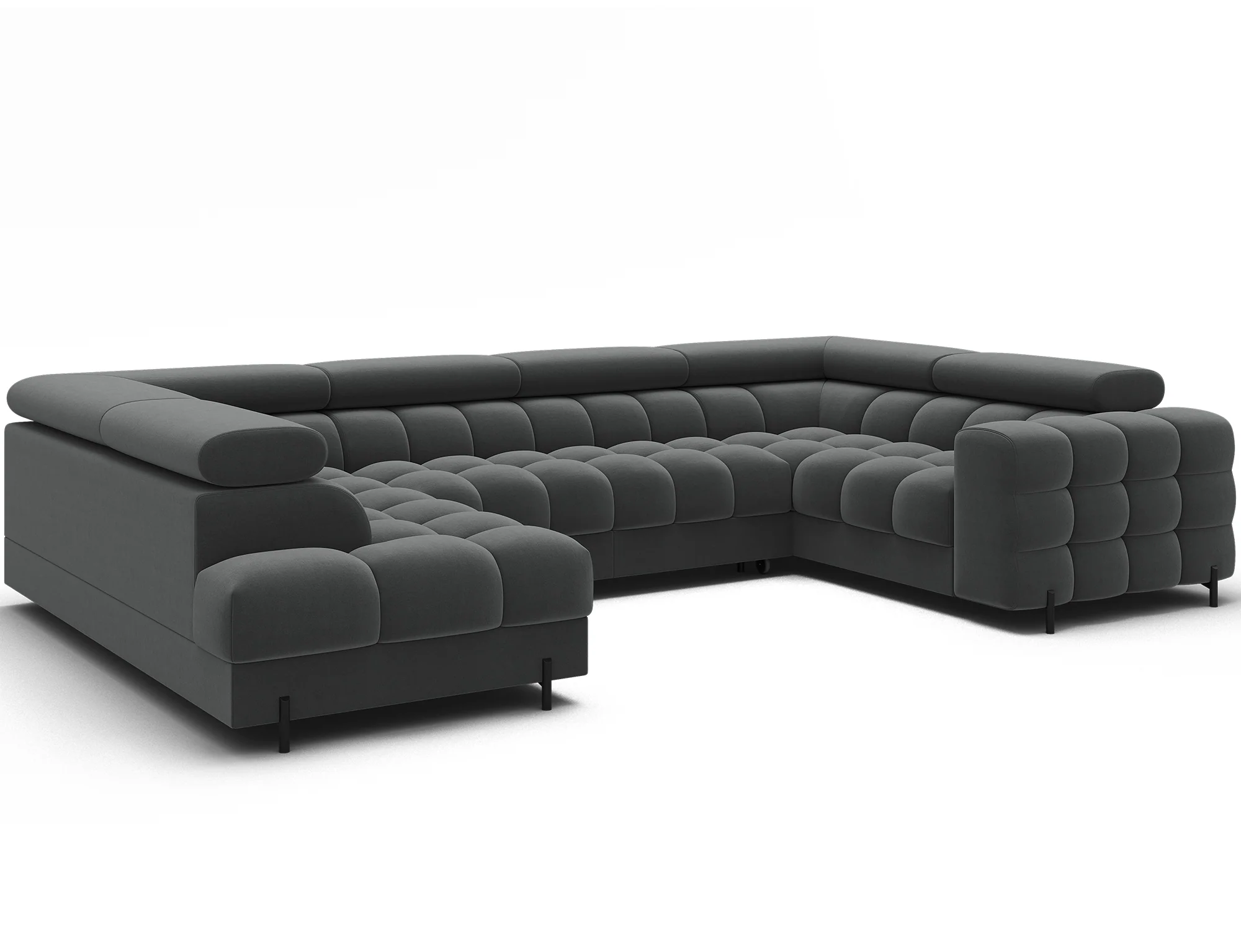 Narożnik z funkcją spania FECTORY to przestronny i komfortowy mebel stworzony z myślą o wspólnym, rodzinnym wypoczynku. Duża bryła w kształcie litery U zapewnia mnóstwo miejsca do siedzenia, relaksu i zabawy, a możliwość wyboru wersji lewej lub prawej pozwala idealnie dopasować narożnik do układu salonu. Miękkie siedziska, dekoracyjne pikowania oraz przytulna forma sprawiają, że FECTORY szybko staje się centralnym punktem wnętrza.
