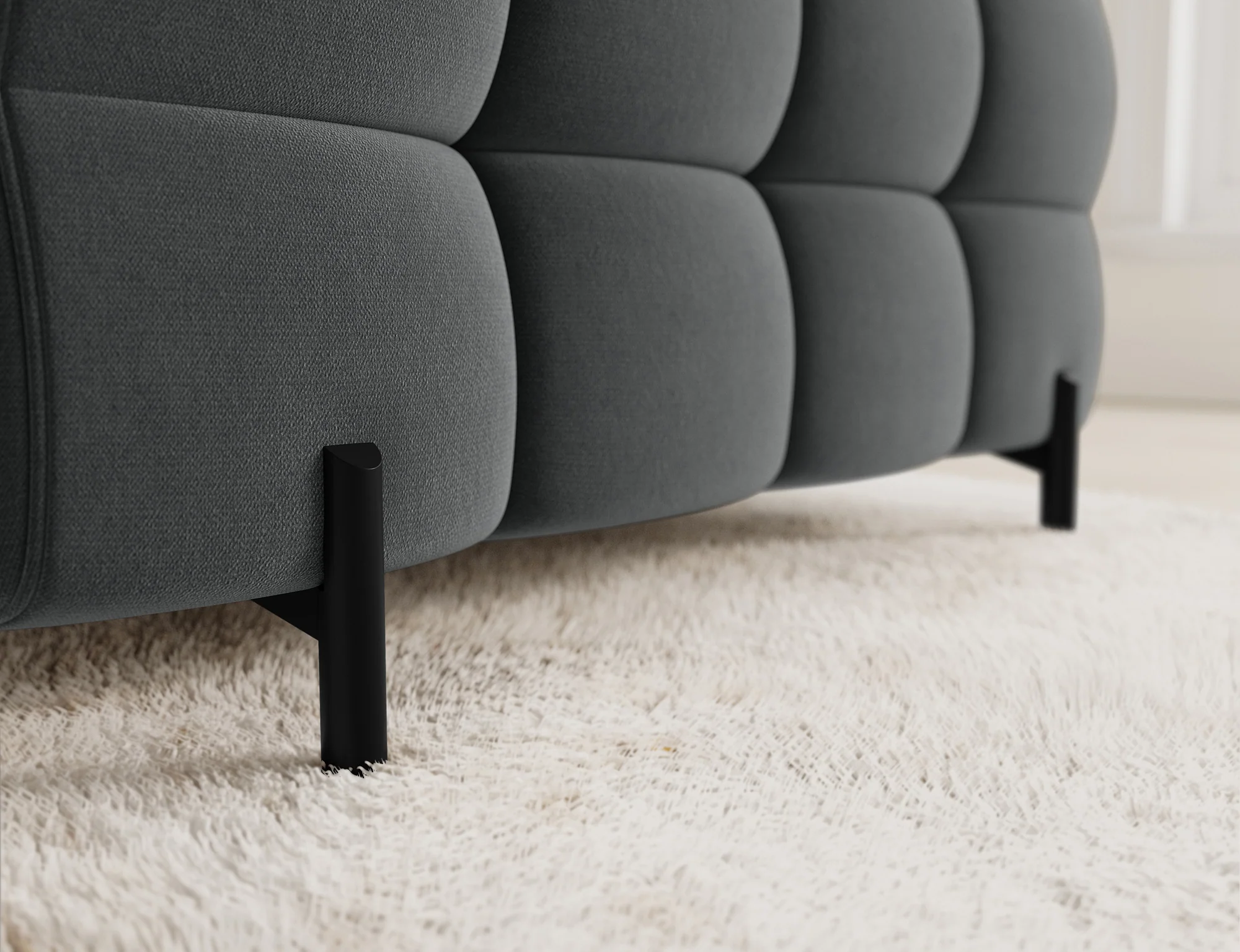 Funkcja spania typu Delfin pozwala szybko i łatwo rozłożyć narożnik, tworząc wygodną powierzchnię do spania o wymiarach 123 × 247 cm. Praktyczny pojemnik na pościel oferuje dodatkowe miejsce do przechowywania kołder, poduszek i domowych tekstyliów. Tapicerowany tył umożliwia ustawienie narożnika także na środku pomieszczenia, a metalowe nogi o wysokości 9 cm dodają lekkości i pozwalają na swobodny przejazd robota sprzątającego.