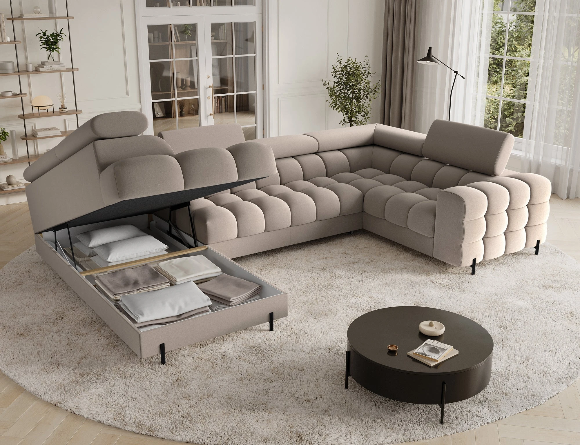 Narożnik z funkcją spania FECTORY to przestronny i komfortowy mebel stworzony z myślą o wspólnym, rodzinnym wypoczynku. Duża bryła w kształcie litery U zapewnia mnóstwo miejsca do siedzenia, relaksu i zabawy, a możliwość wyboru wersji lewej lub prawej pozwala idealnie dopasować narożnik do układu salonu. Miękkie siedziska, dekoracyjne pikowania oraz przytulna forma sprawiają, że FECTORY szybko staje się centralnym punktem wnętrza.