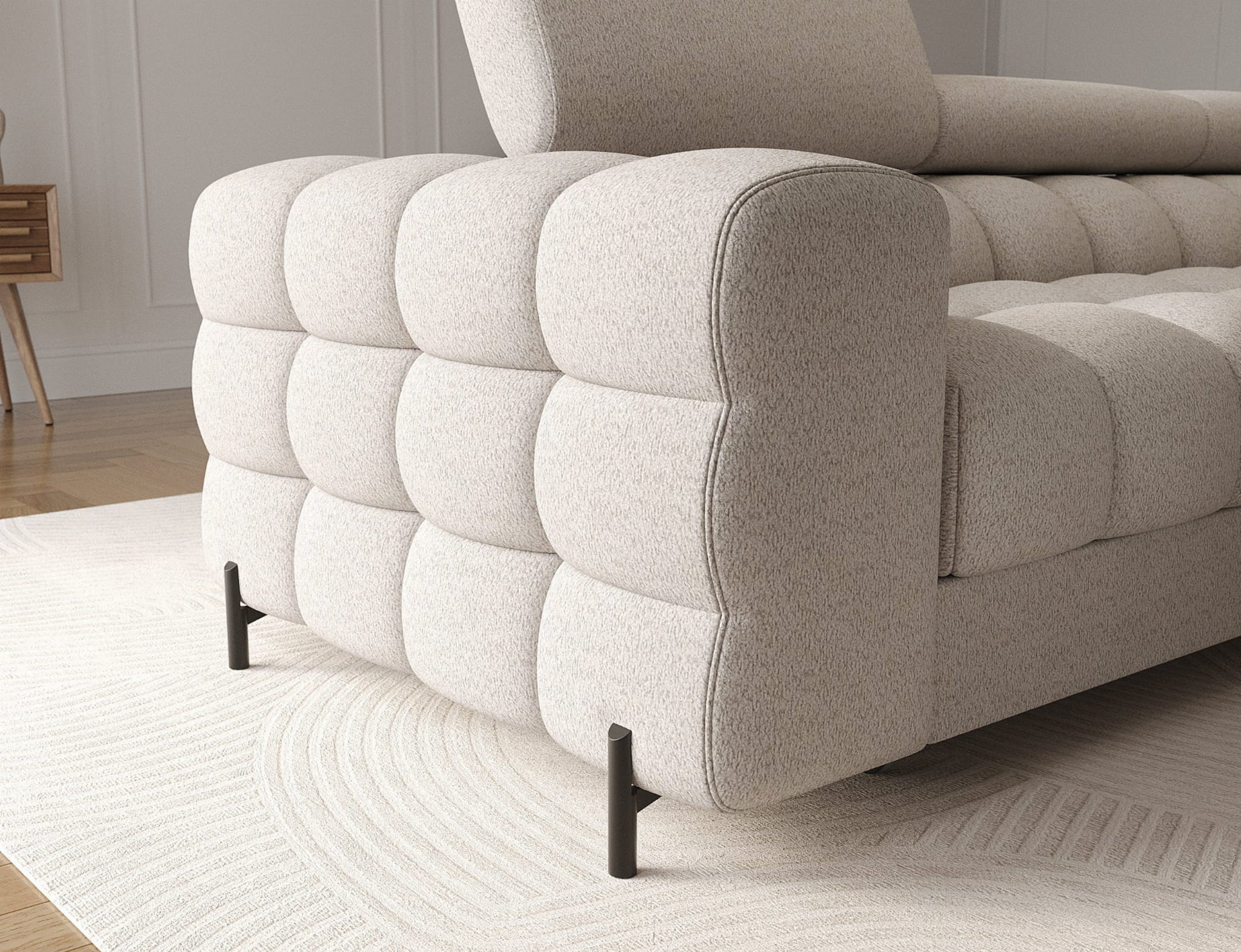 Każdy element narożnika FELRO został starannie przemyślany, by służył Ci przez lata: solidna konstrukcja oparta na trwałym stelażu i metalowych nóżkach malowanych proszkowo na czarno – odporna na obciążenia i stabilna nawet przy intensywnym użytkowaniu, siedzisko z pianek T3030 i HR3030 oraz sprężyn falistych typu B – zapewnia optymalne podparcie dla ciała i wygodę na co dzień, oparcie z elastycznej pianki T2130 – miękkie, ale sprężyste, dopasowujące się do sylwetki, ruchome zagłówki – reguluj je według własnych potrzeb, by maksymalnie zwiększyć komfort wypoczynku. To mebel stworzony do relaksu – niezależnie od tego, czy spędzasz wieczór z książką, filmem, czy po prostu z rodziną.
