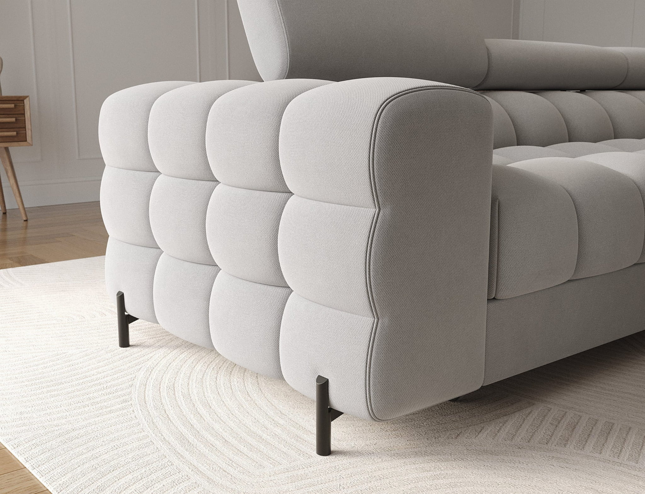 Każdy element narożnika FELRO został starannie przemyślany, by służył Ci przez lata: solidna konstrukcja oparta na trwałym stelażu i metalowych nóżkach malowanych proszkowo na czarno – odporna na obciążenia i stabilna nawet przy intensywnym użytkowaniu, siedzisko z pianek T3030 i HR3030 oraz sprężyn falistych typu B – zapewnia optymalne podparcie dla ciała i wygodę na co dzień, oparcie z elastycznej pianki T2130 – miękkie, ale sprężyste, dopasowujące się do sylwetki, ruchome zagłówki – reguluj je według własnych potrzeb, by maksymalnie zwiększyć komfort wypoczynku. To mebel stworzony do relaksu – niezależnie od tego, czy spędzasz wieczór z książką, filmem, czy po prostu z rodziną.