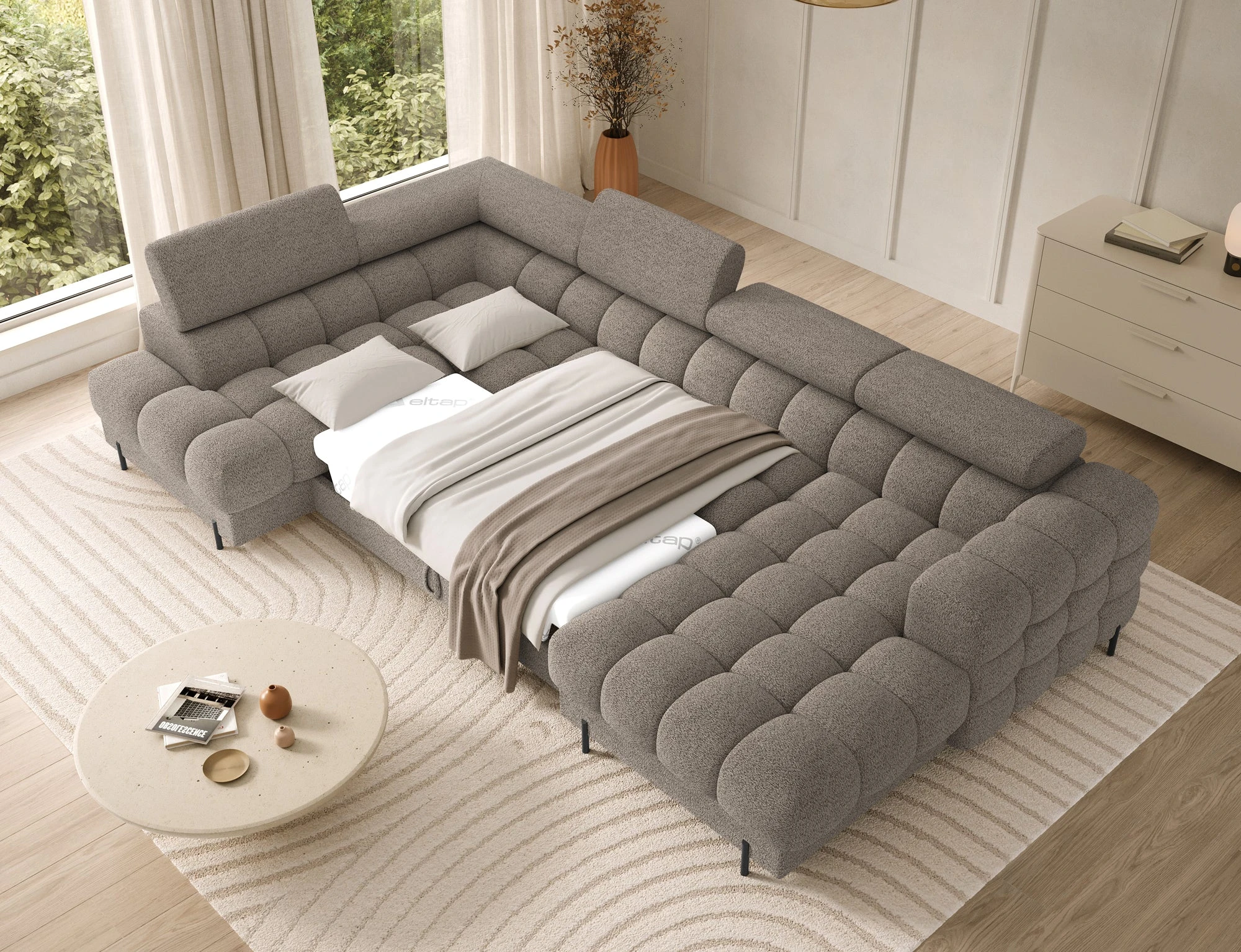 Narożnik FERARIA U-Kształtny to prawdziwe serce salonu – imponujący mebel, który natychmiast przyciąga wzrok i staje się centralnym punktem codziennego życia. Zaprojektowany z myślą o rodzinach, gościnnych domach i osobach, które kochają przestrzeń oraz komfort, oferuje miejsce do wspólnego odpoczynku, spotkań i relaksu po długim dniu. Dzięki szerokości 358 cm i głębokości 202 cm, narożnik zapewnia ogromną przestrzeń do wypoczynku – nawet dla kilku osób jednocześnie. To idealne rozwiązanie dla dużych salonów, gdzie liczy się wygoda, ale także dla przestrzeni otwartych, gdzie mebel może pełnić funkcję naturalnego podziału stref.