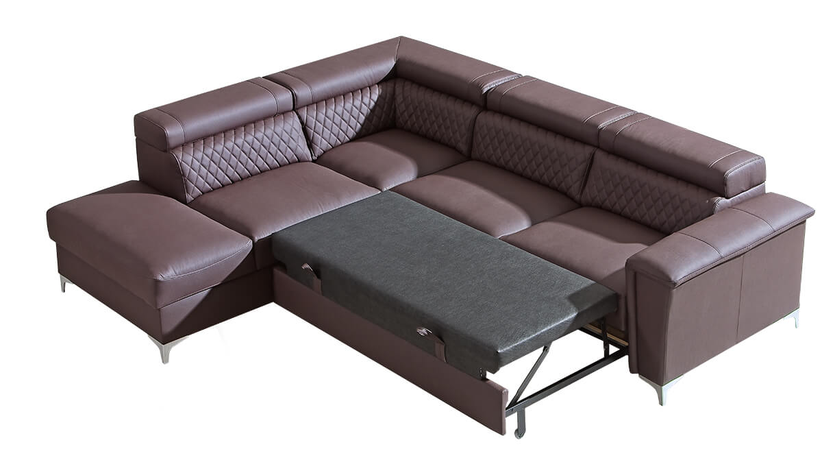 Meble posiadają regulowane zagłówki i stoją na wysokich srebrnych nóżkach.