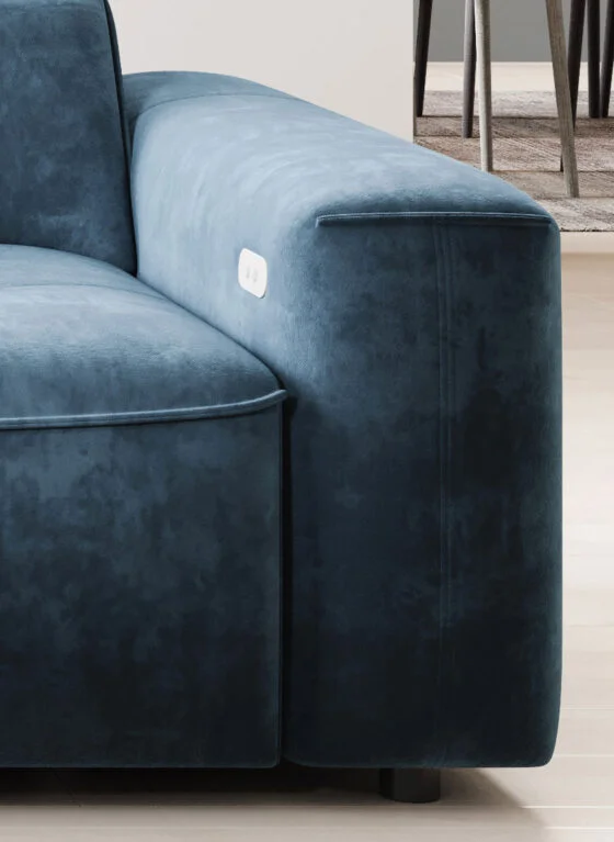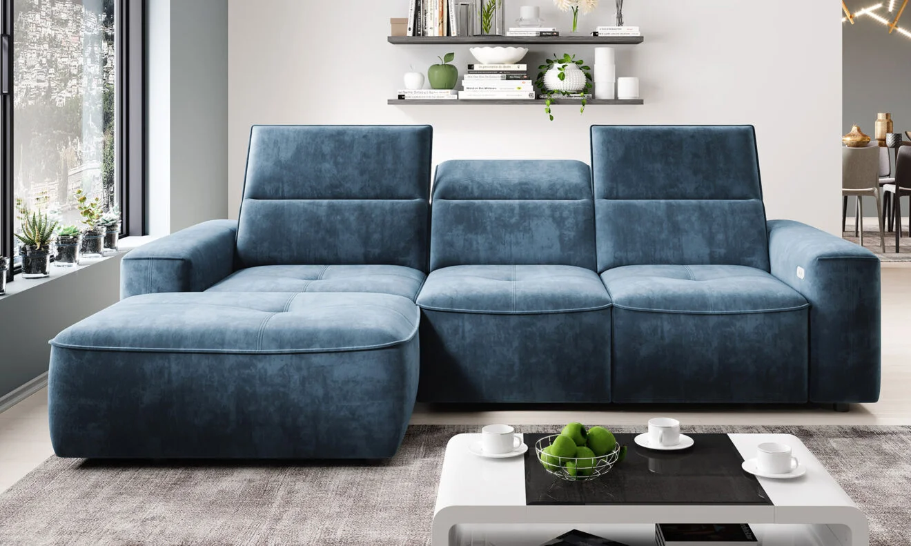 To nowoczesny narożnik który został wyposażony w elektryczną regulację głębokości siedziska, regulowane zagłówki, pojemnik na pościel.