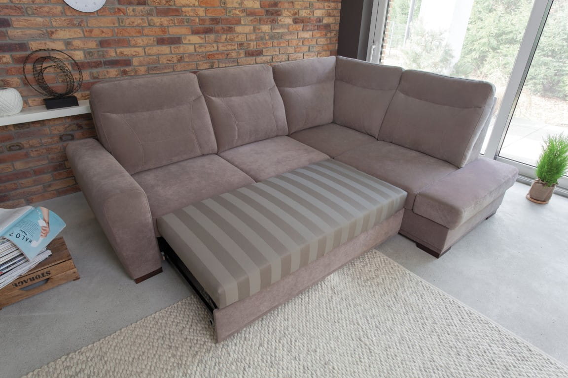 Mechanizm rozkładania typu Delfin ułatwia rozłożenie narożnika, szybko przekształcisz go w łóżko. Dodatkowa powierzchnia spania jest niezwykle przydatna podczas wizyty gości.