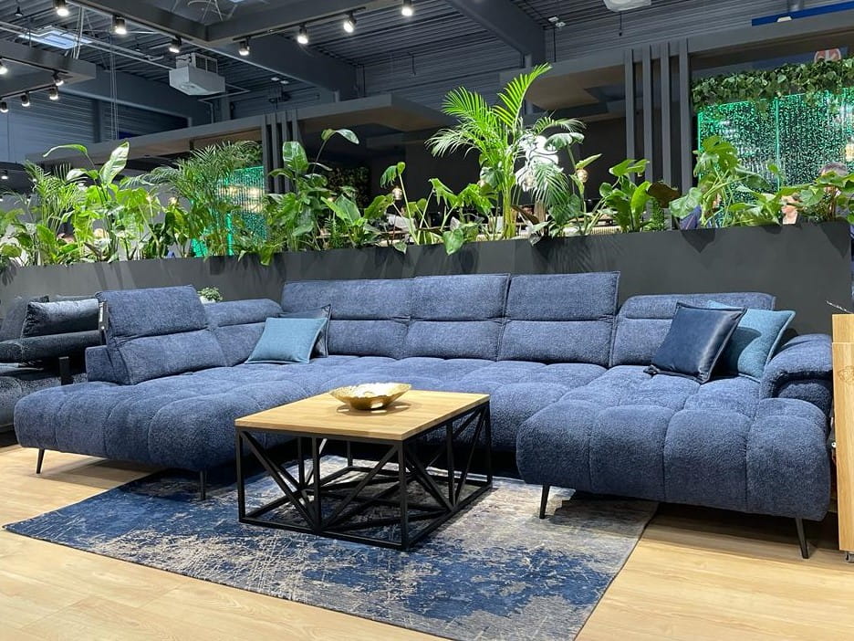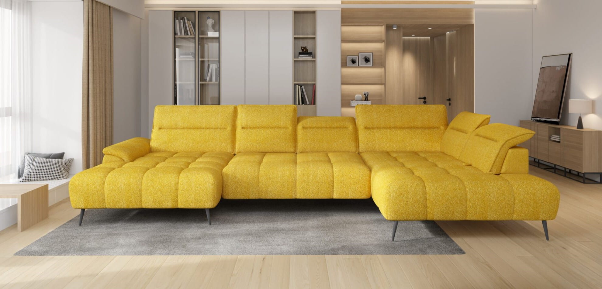 Narożnik MONTANA XL U Funkcja RELAX Regulowany Zagłówek Do Salonu Tkanina Boucle