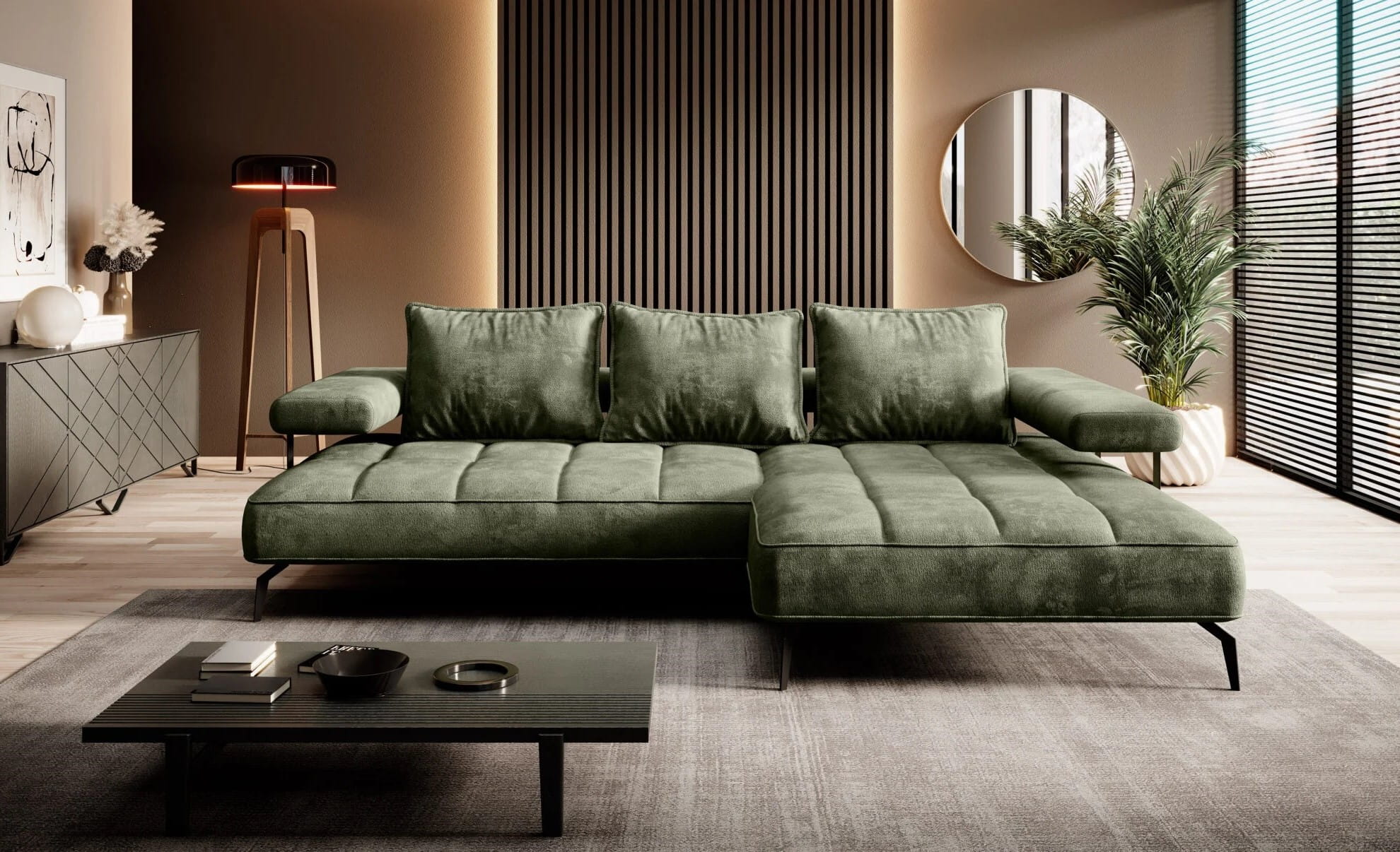 Eleganckie przeszycia dodają narożnikowi wdzięku, a zagłówki umiejscowione na metalowych uchwytach sprawiają, że mebel wyróżnia się swoim wyglądem.