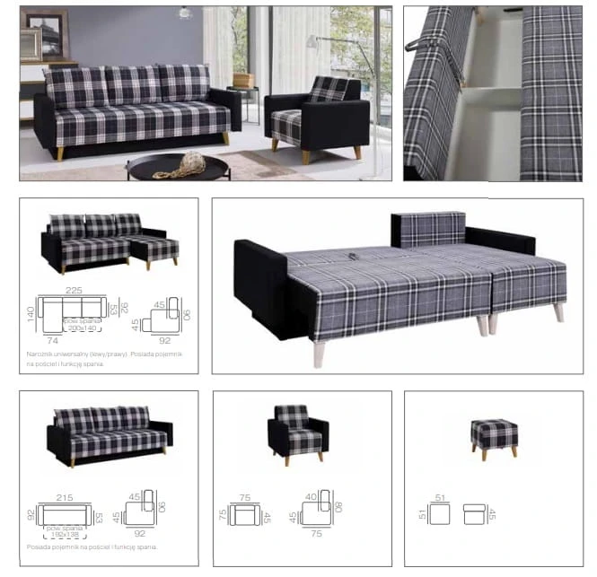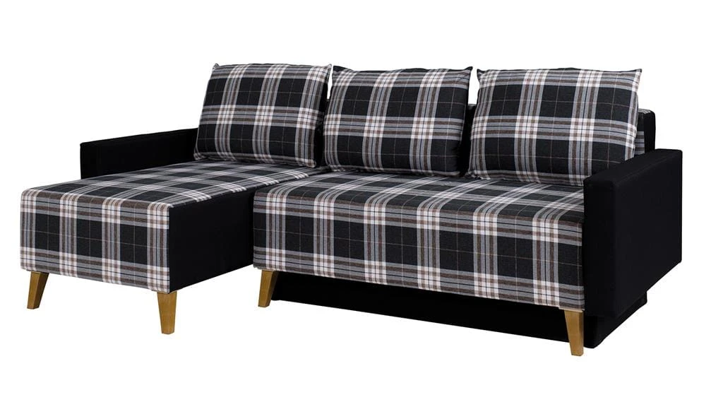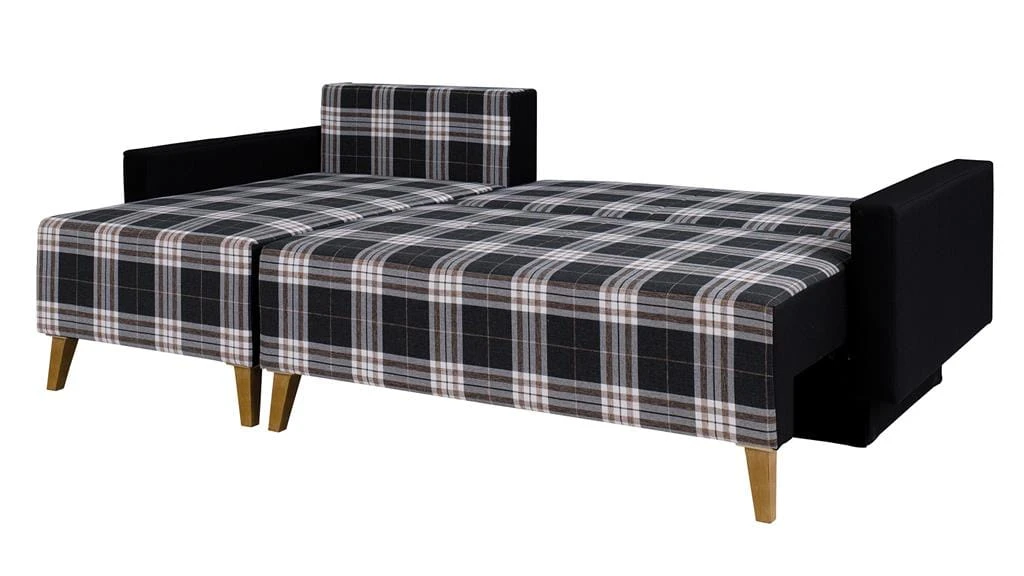 rozkładany narożnik w stylu skandynawskim z funkcją spania i pojemnikiem na pościel.