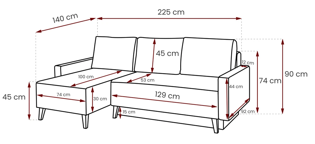 Narożnik został wyposażony w jedną z większych na rynku funkcję spania o powierzchni 140 x 200 cm, dzięki takim rozmiarom wygodnie można przespać całą noc.
