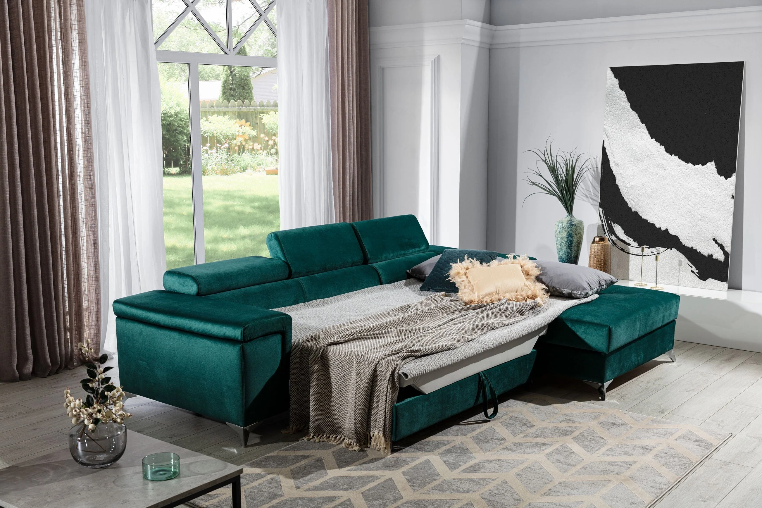 Projektując narożnik RICARDO, skupiono się na funkcjonalności, komforcie i estetyce. To mebel, który zachwyca już na pierwszy rzut oka – nowoczesna bryła, stylowe przeszycia, delikatne pikowania i chromowane nogi tworzą harmonijną całość, pasującą do każdego współczesnego wnętrza. Dzięki zastosowanemu systemowi delfin, narożnik RICARDO z łatwością zmienisz w łóżko. To funkcjonalne rozwiązanie, które pozwala na szybkie rozłożenie mebla i uzyskanie wygodnej powierzchni spania – doskonałej zarówno na codzienny sen, jak i okazjonalne noclegi gości.