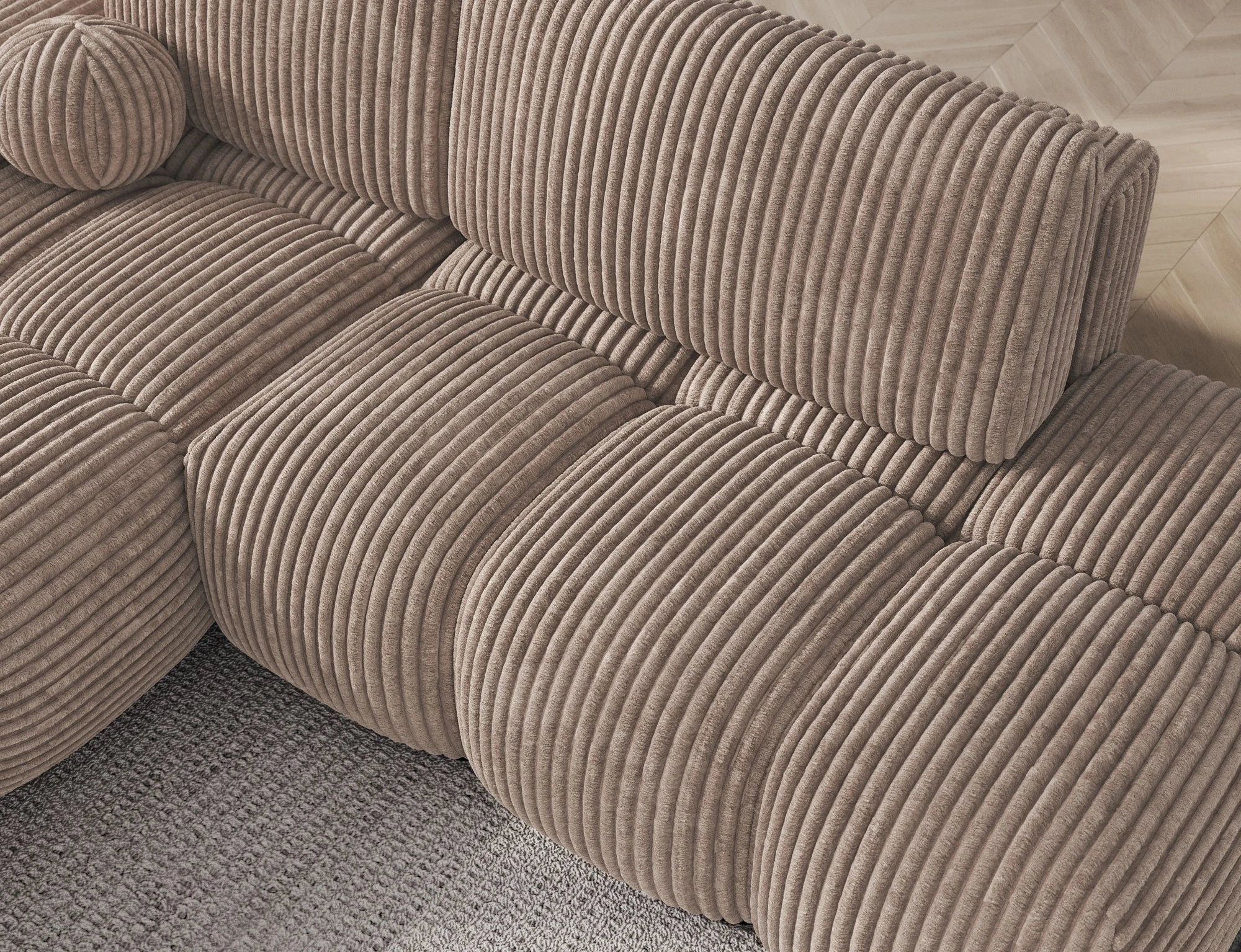 Nowoczesny narożnik VITTARIO to wyjątkowe połączenie miękkiej, obłej formy w stylu modern soft living i praktycznej funkcjonalności, która sprawdzi się w codziennym użytkowaniu. Jego elegancki kształt wprowadza do wnętrza harmonię i lekkość, a starannie dobrane materiały gwarantują komfort, który czuć od pierwszego momentu.