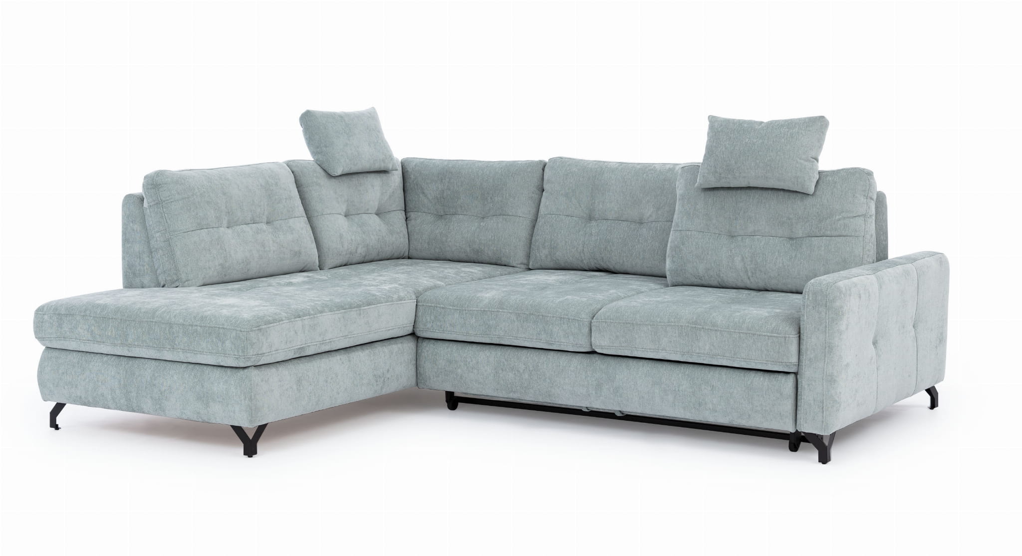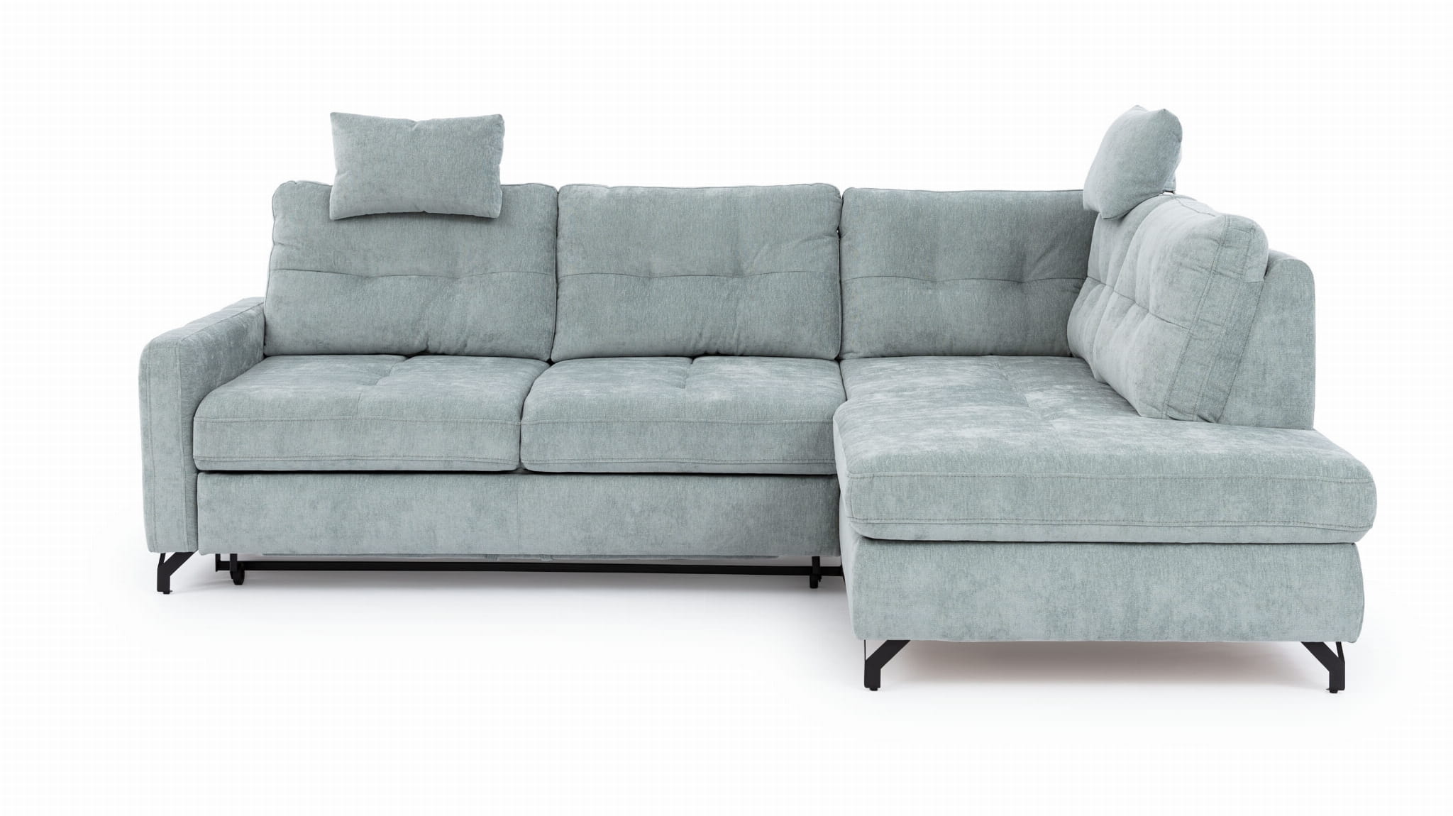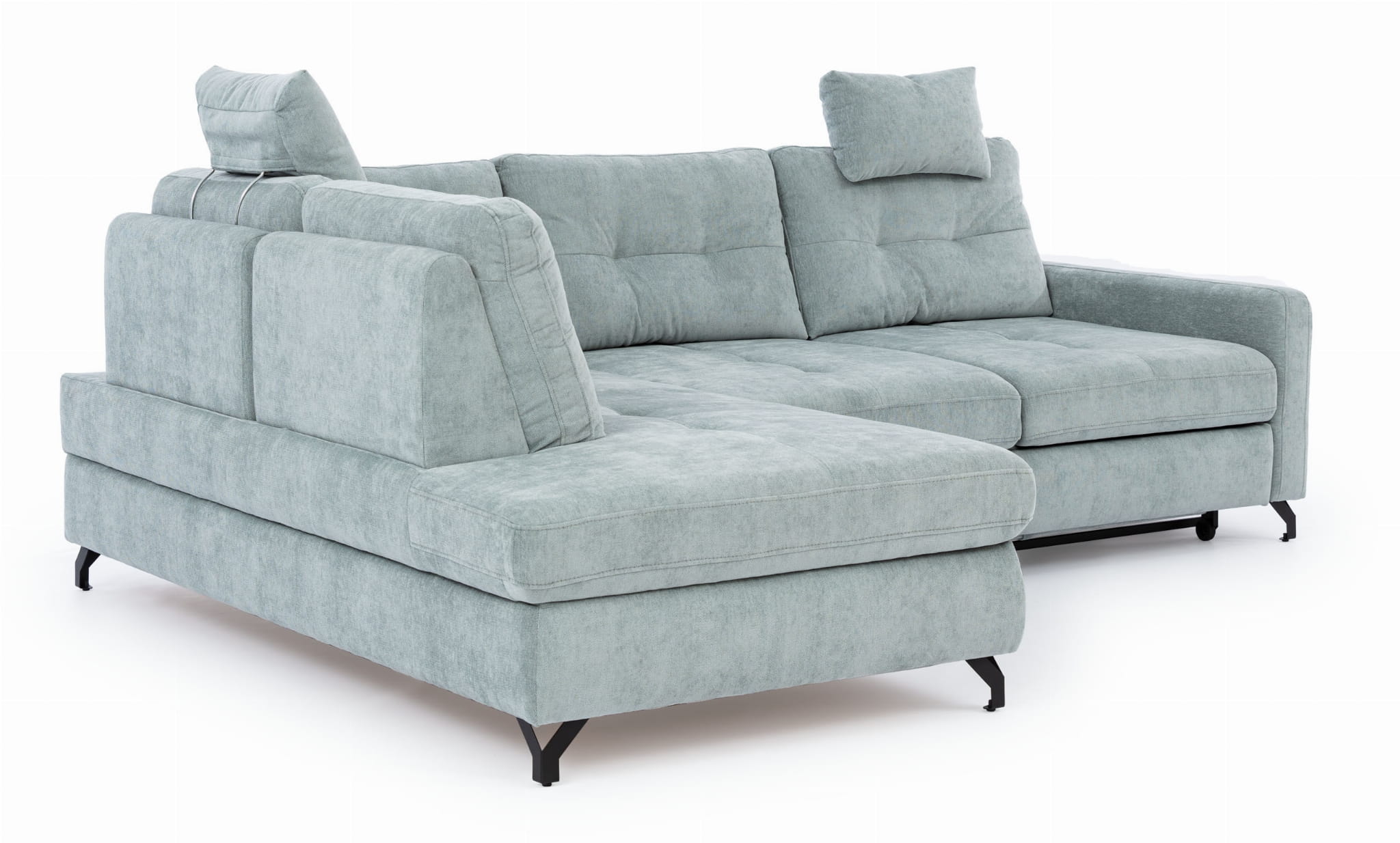 Wysokie nóżki sprawiają, że ten narożnik do salonu wygląda bardzo lekko i zgrabnie. Taka budowa nie tylko nadaje narożnikowi nowoczesnego stylu, ale też ułatwia sprzątanie pod nim bez konieczności przesuwania ciężkich elementów. Mimo swojej delikatnej formy, nowoczesny narożnik jest w pełni stabilny dzięki mocnemu stelażowi, co gwarantuje bezpieczeństwo i pewność podczas siedzenia przez bardzo długi czas.