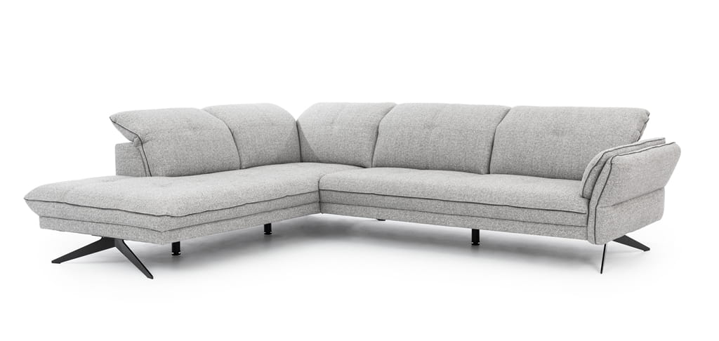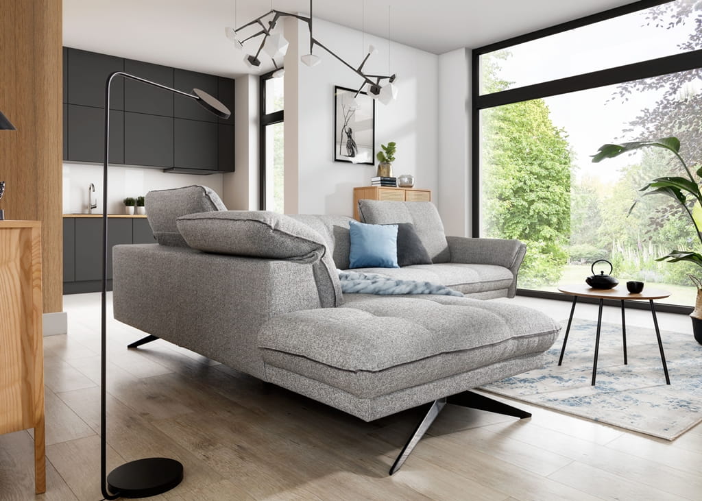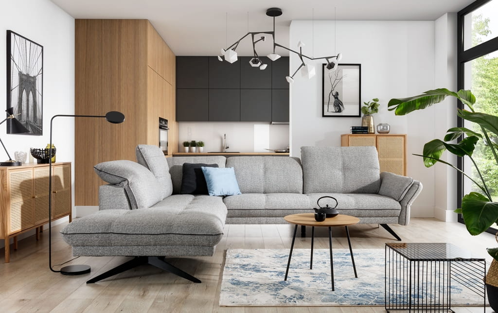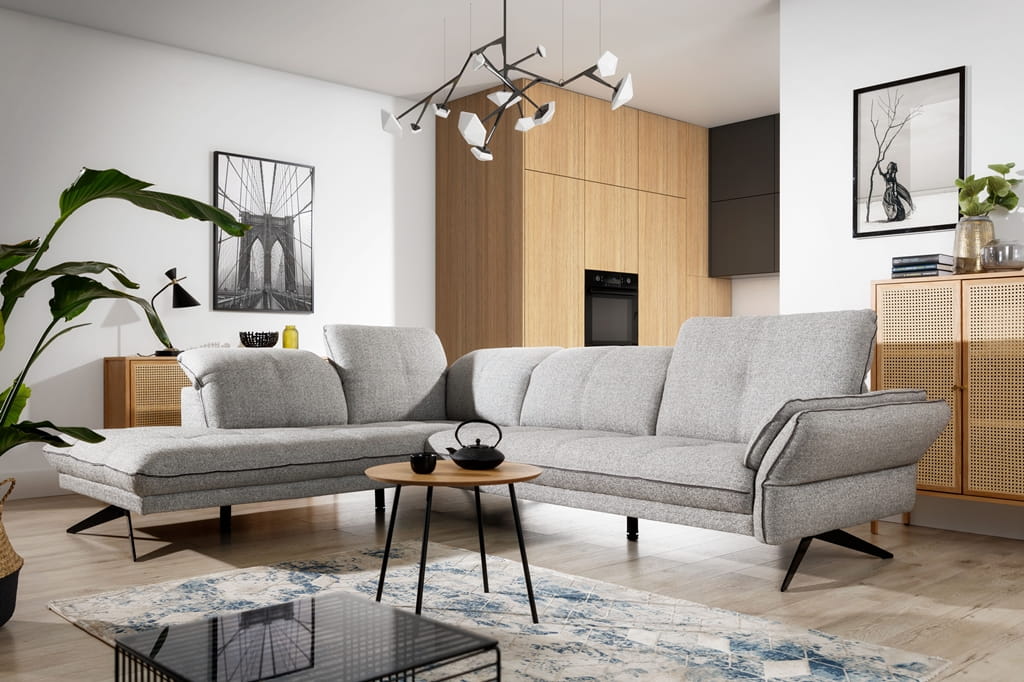 Ten duży narożnik został stworzony, aby cieszyć oko swoją współczesną linią i dawać mnóstwo swobody domownikom. Szerokość 310 cm powoduje, że jest to doskonały narożnik do dużego salonu, gdzie każdy znajdzie dla siebie wygodne miejsce. Narożnik w kształcie L na wysokich nóżkach optycznie powiększa przestrzeń, bo widać pod nim podłogę, co sprawia, że wnętrze wydaje się bardziej jasne i uporządkowane.