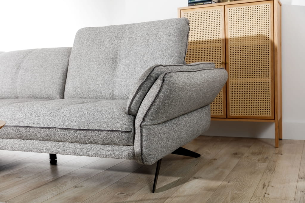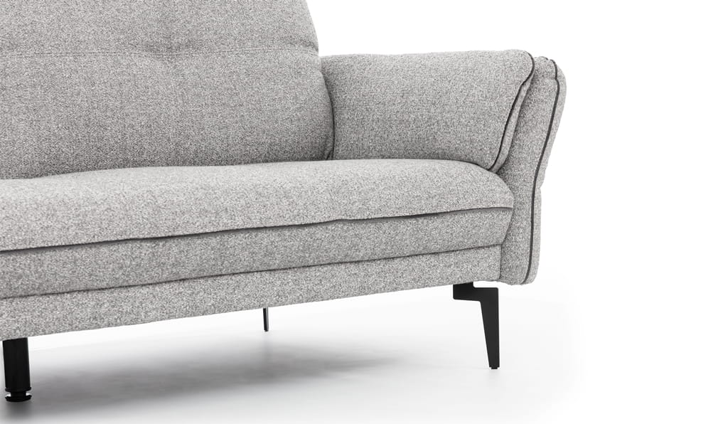 Szary kolor materiału to pewny zakup – pasuje do wszystkiego i zawsze wygląda profesjonalnie. Model ten posiada jeden regulowany podłokietnik, który możesz ustawić tak, jak Tobie wygodnie. Brak niepotrzebnych ozdób sprawia, że ten nowoczesny narożnik prezentuje się bardzo schludnie, stając się głównym punktem wypoczynku w Twoim domu.