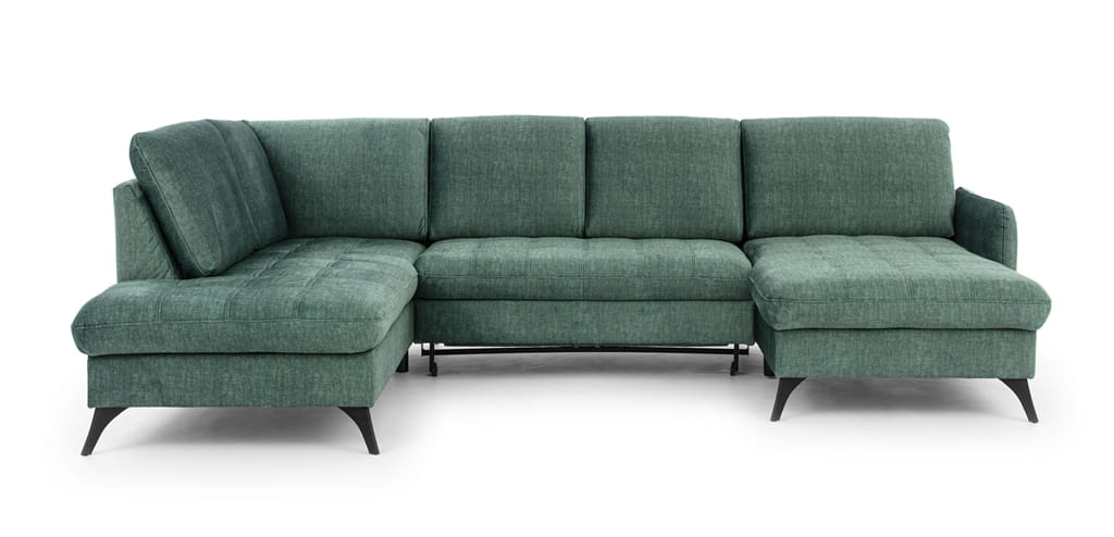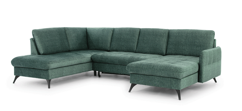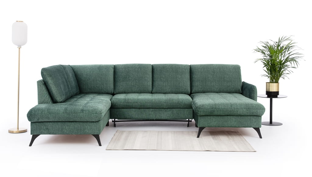 Ten zielony narożnik o szerokości 300 cm to mebel stworzony dla rodzin, które potrzebują bardzo dużo miejsca do wspólnego odpoczynku. Dzięki konstrukcji w kształcie litery U, ten duży narożnik do salonu zapewnia każdemu domownikowi mnóstwo swobody, a jeden wygodny podłokietnik nadaje całej bryle nowoczesny, lekki wygląd. Jasny odcień butelkowej zieleni sprawia, że pokój staje się bardziej elegancki i przytulny, co czyni ten narożnik głównym punktem całego wnętrza.