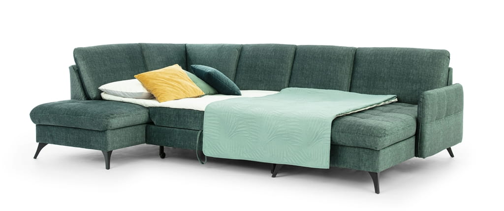 Narożnik z funkcją spania – zielony narożnik z pojemnikiem na pościel