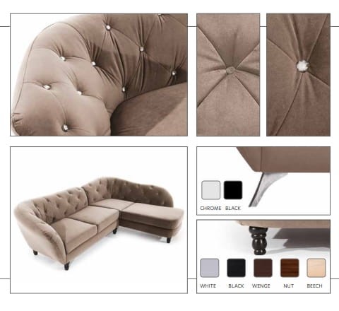 Dzięki możliwości wyboru spośród dwóch typów pikowania oraz różnych wariantów nóżek, mebel idealnie dopasuje się do Twojej wizji. Drewniane nogi w pięciu kolorach pozwalają na harmonijne zestawienie sofy z kolorem podłogi, co podkreśla indywidualny charakter Twojej aranżacji.