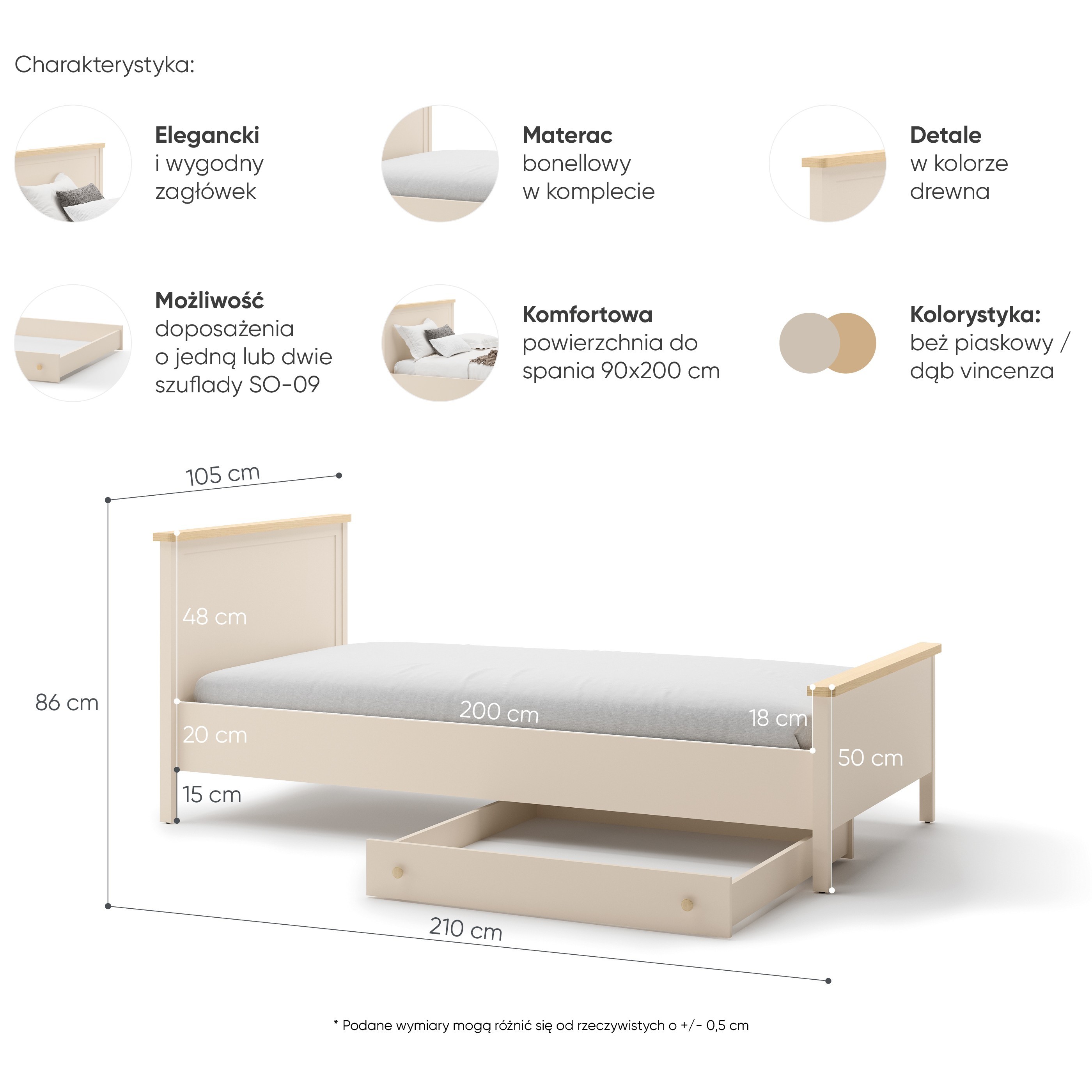Łóżko 90 STORY SO-16 Szerokość 105 cm Beż Piaskowy / Dąb Vincenza