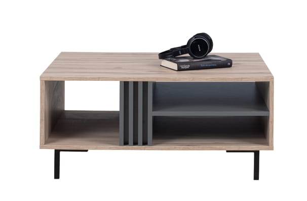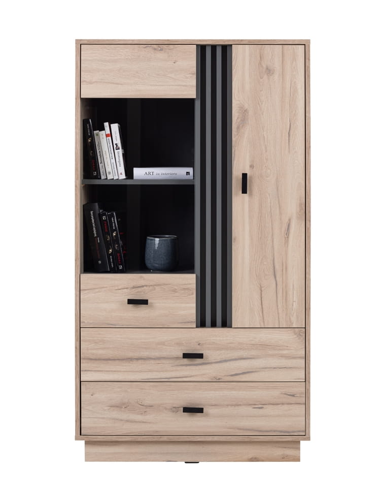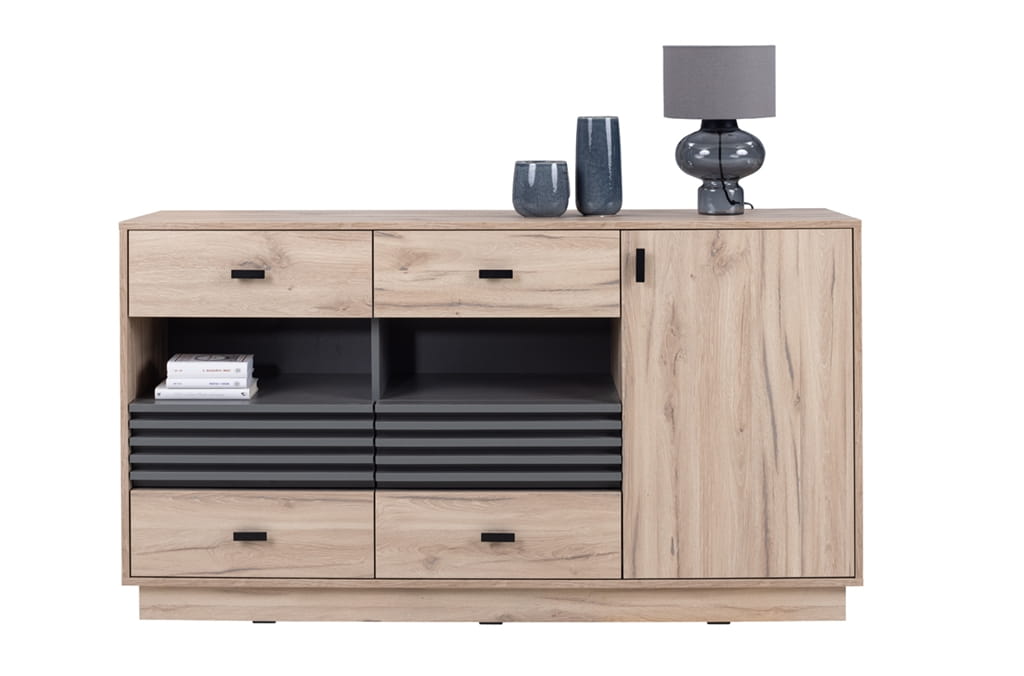 Meble ALLMO to gwarancja pięknie wykończonego salonu, ale przede wszystkim dodadzą mu charakteru. Bez wątpienia drewnopodobne fronty w połączeniu z antracytową wstawką lameli stworzą w pomieszczeniu oryginalny i nowoczesny design.