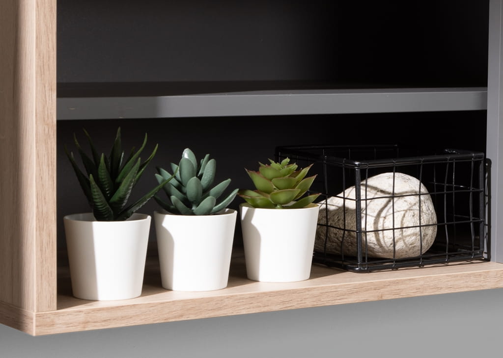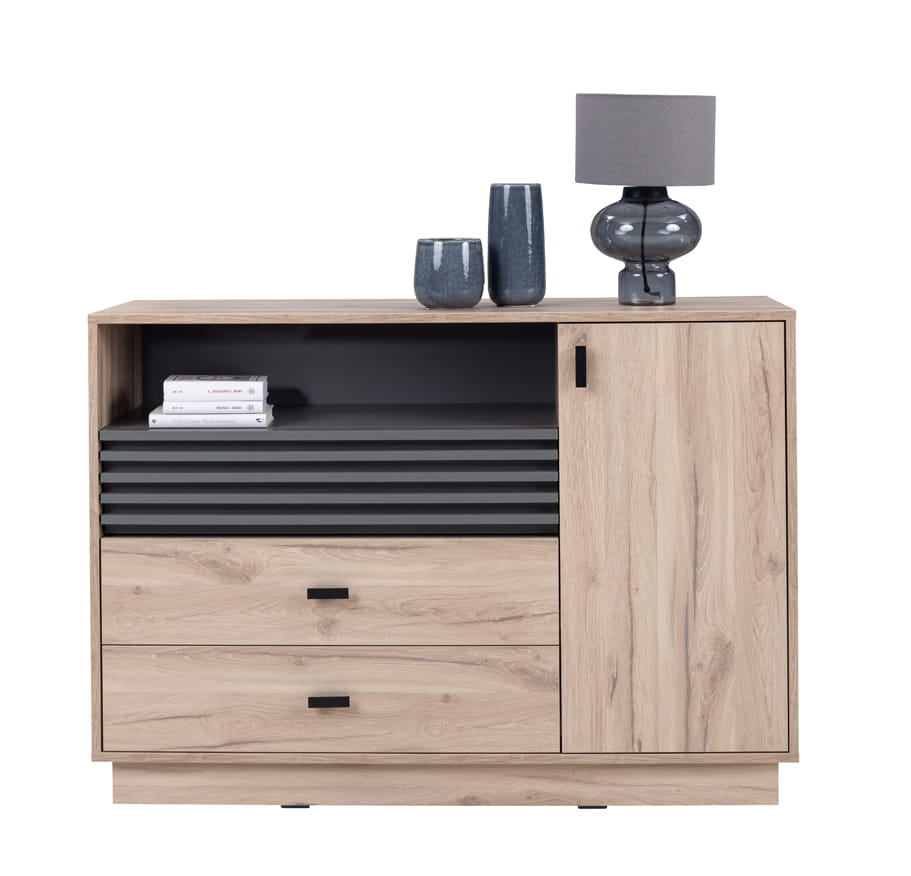 Meble ALLMO to gwarancja pięknie wykończonego salonu, ale przede wszystkim dodadzą mu charakteru. Bez wątpienia drewnopodobne fronty w połączeniu z antracytową wstawką lameli stworzą w pomieszczeniu oryginalny i nowoczesny design.
