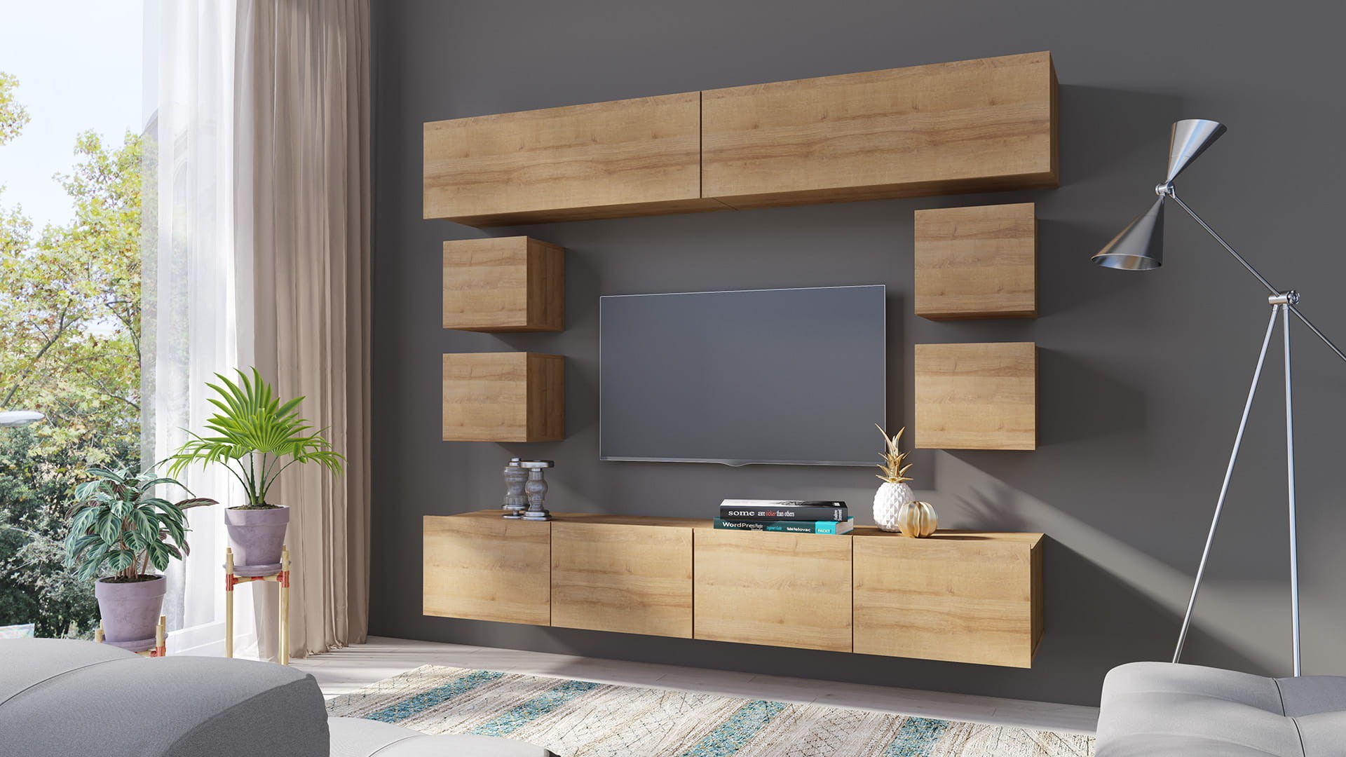 Cechą charakterystyczną prezentowanej kolekcji jest brak uchwytów w szafkach, a także możliwość swobodnego ustawienia meblościanki w zależności od indywidualnych preferencji i potrzeb.