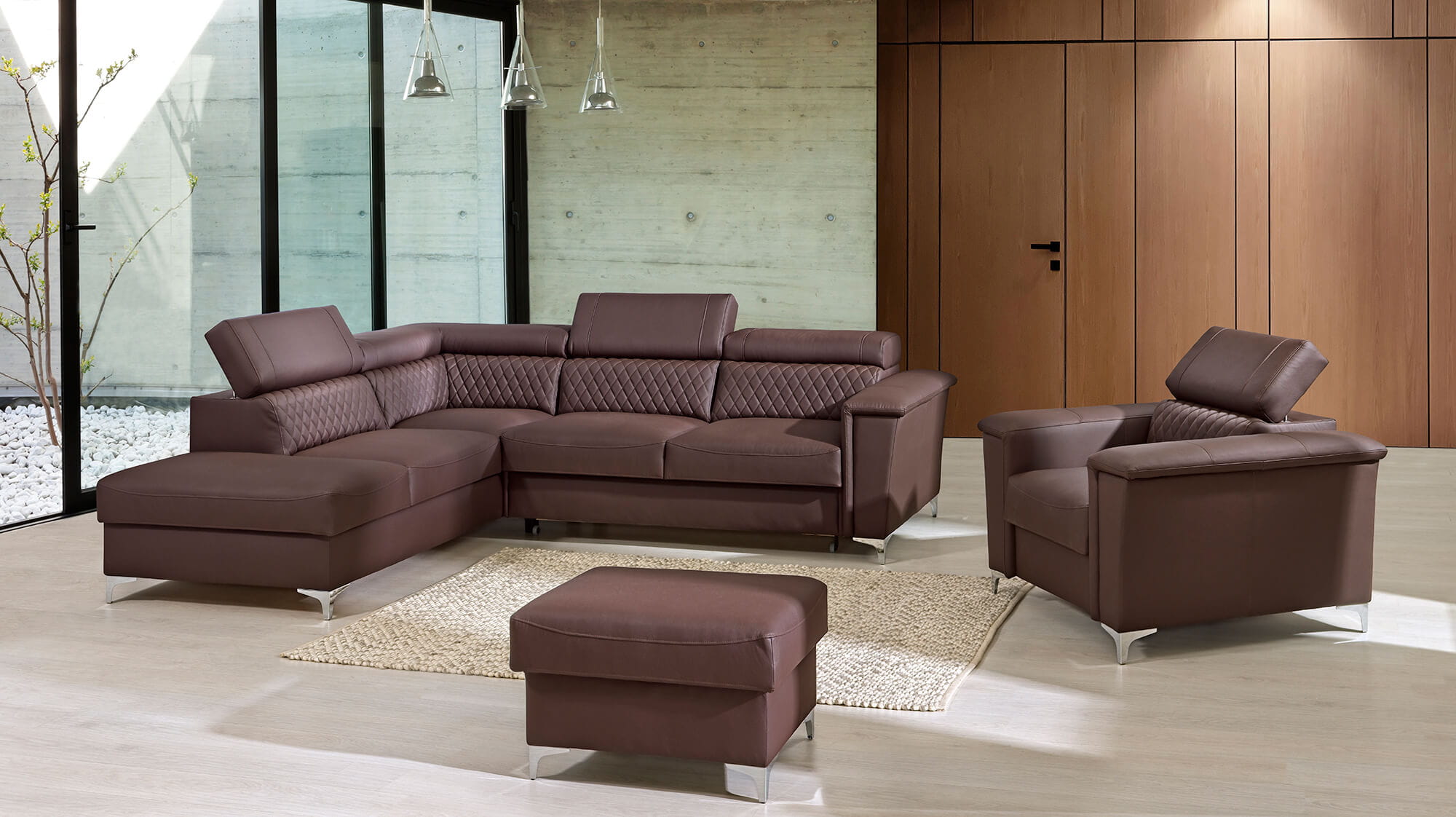 Meble posiadają regulowane zagłówki i stoją na wysokich srebrnych nóżkach.
