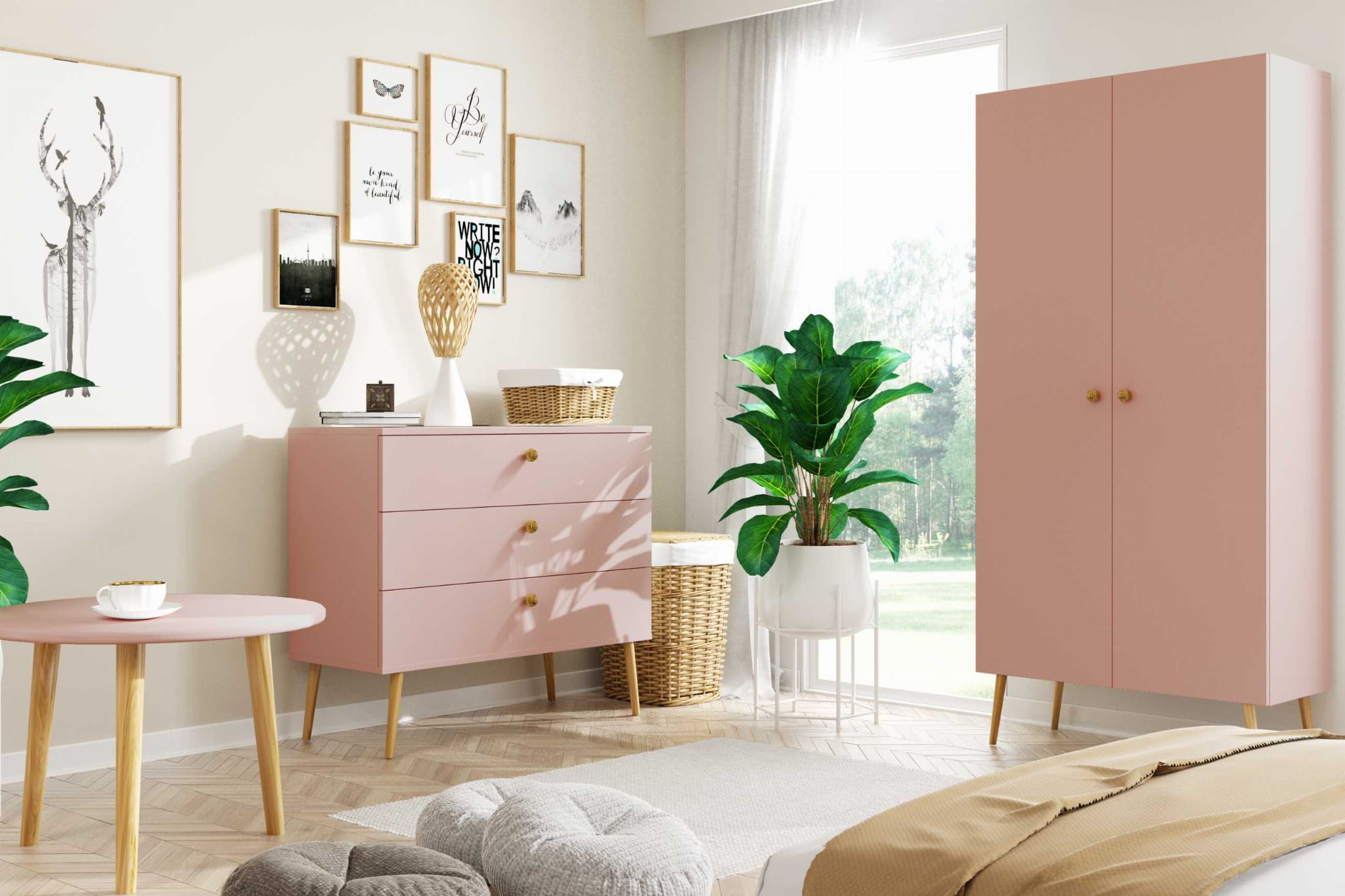 Zestaw mebli skandynawskich na wysokich nóżkach ociepli wnętrze twojego mieszkania, a optycznie stanie się ono bardziej przestronne.