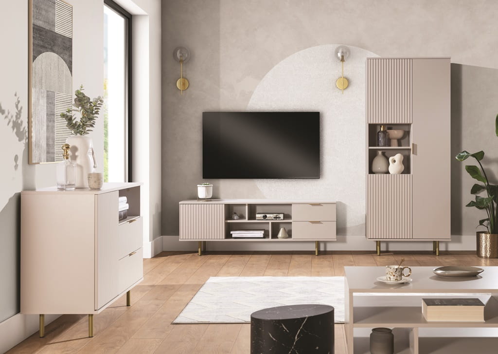 Regał Do Salonu Beżowy 80 cm Szuflady Drzwi Cashmere Front Ryflowany Kaszmir NUBIA NB-04