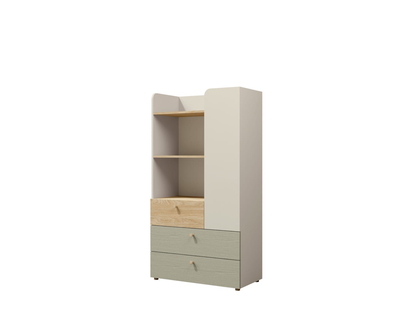Młodzieżowy regał średni YUKI posiada 3 szuflady, 2 półki oraz szafkę za frontem, jest pojemny i funkcjonalny, a jego prosty design idealnie wkomponuje się we wnętrze pokoju dla dziecka, czy też nastolatka.