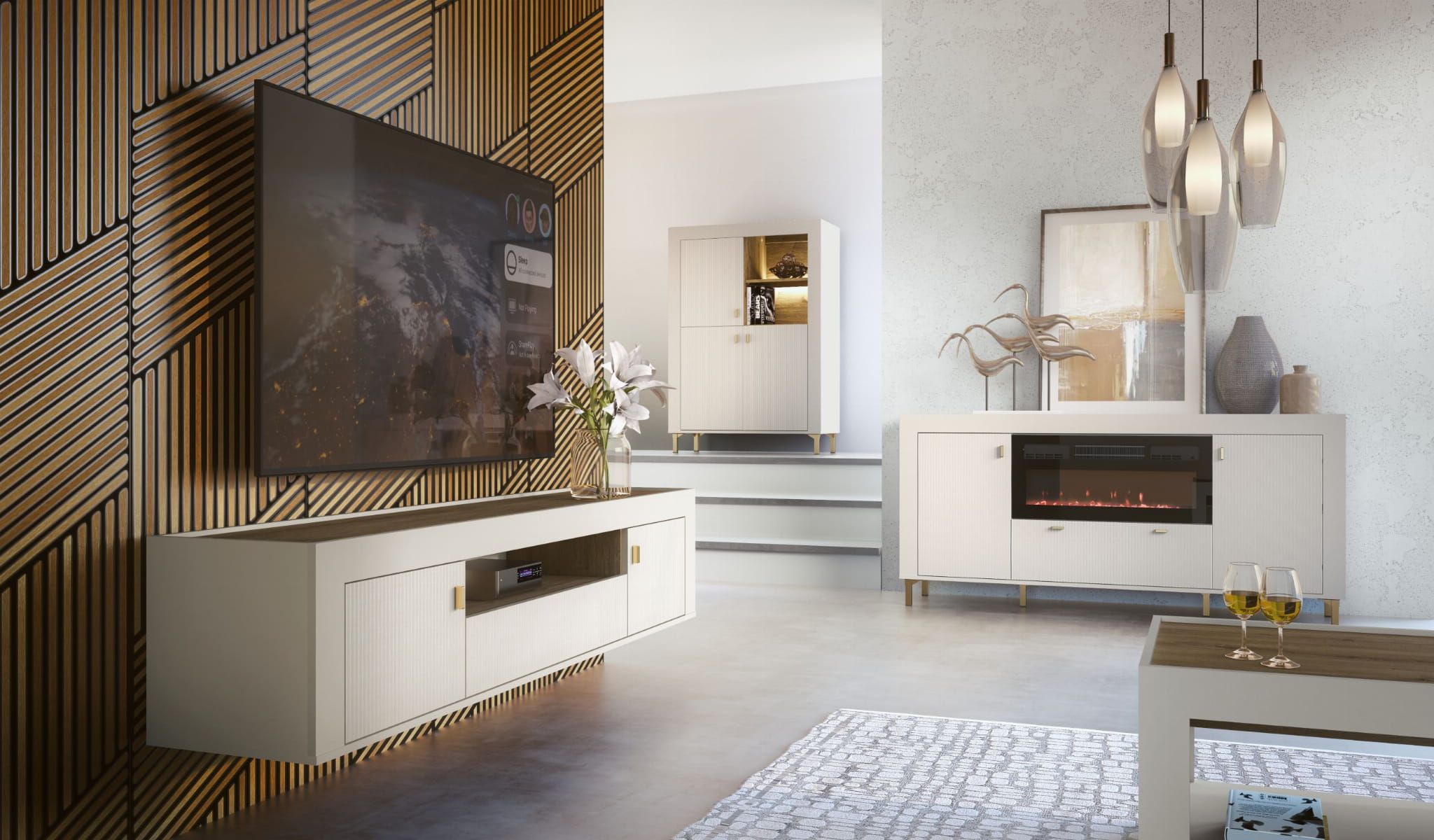 Szeroki wybór elementów pozwala na indywidualną aranżację wnętrza każdego pomieszczenia w domu. W skład kolekcji wchodzą: komody, witryny, szafy, regały, szafka RTV, ława, toaletka i stoliki nocne, a także szafka nocna. Każdy mebel wyróżnia wyjątkowy, prestiżowy design i funkcjonalność. Optymalne wymiary i przemyślane wnętrza brył pozwalają na uporządkowanie rzeczy i drobiazgów niezbędnych w każdym domu.