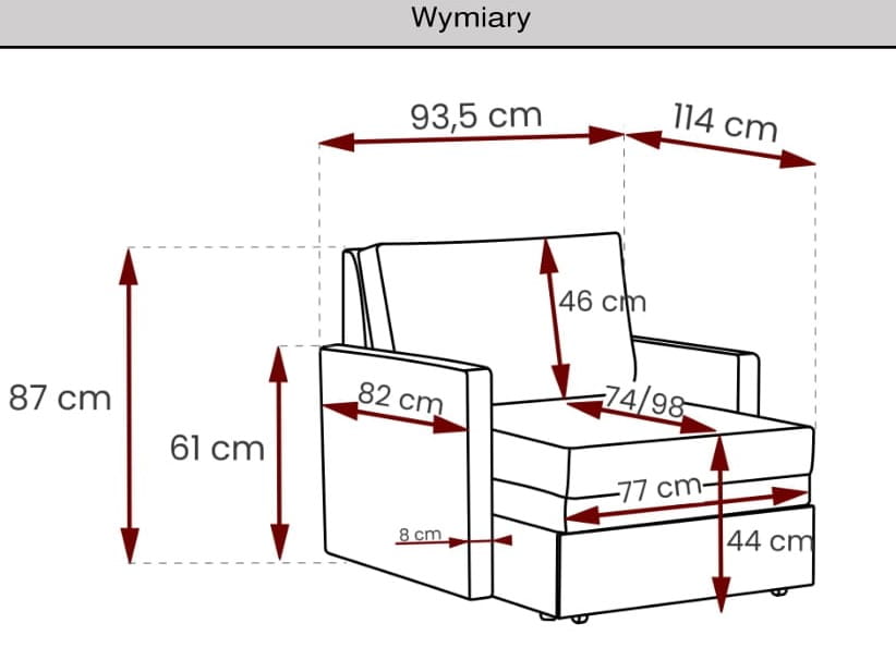 Podstawową cechą i jednocześnie zaletą jest jego funkcjonalność – posiada funkcję spania rozkładaną do przodu mebla, powierzchnia spania 193 x 77cm