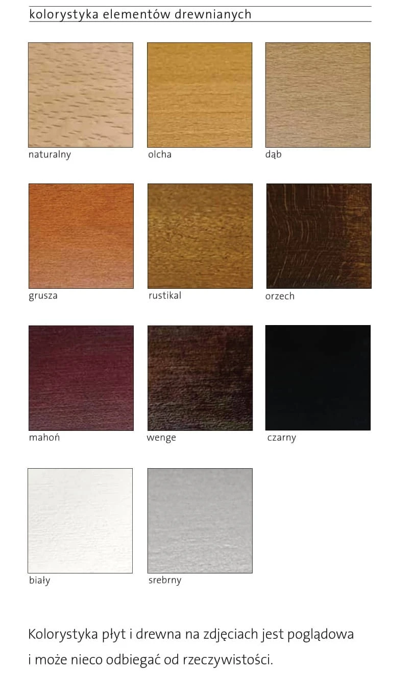 Ze względu na ograniczenia wynikające z techniki zapisu cyfrowego oraz wyświetlania obrazu na poszczególnych urządzeniach elektronicznych kolory tkanin lub drewna mogą odbiegać od rzeczywistych.