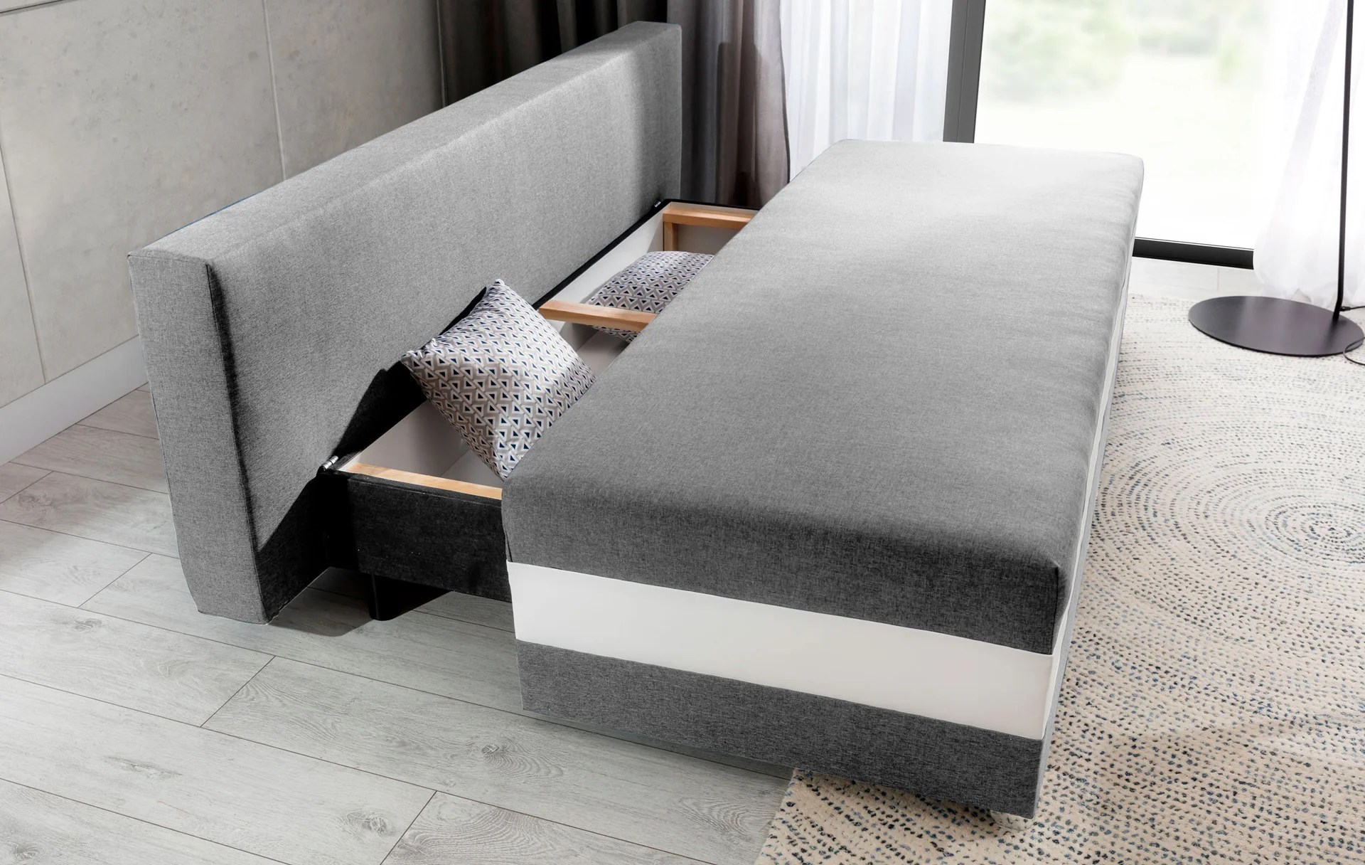 Wymiary 195 x 91 x 83 cm sprawiają, że CALIA to kompaktowa, ale przestronna kanapa, która doskonale sprawdzi się zarówno w dużych salonach, jak i mniejszych mieszkaniach. A kiedy dzień dobiega końca? Mechanizm przewracanego oparcia pozwala szybko przekształcić kanapę w łóżko o powierzchni 195 x 134 cm. Pojemnik na pościel pozwala przechowywać wszystkie niezbędne tekstylia bez dodatkowych mebli. To idealne rozwiązanie dla osób ceniących praktyczne i estetyczne rozwiązania w jednym.