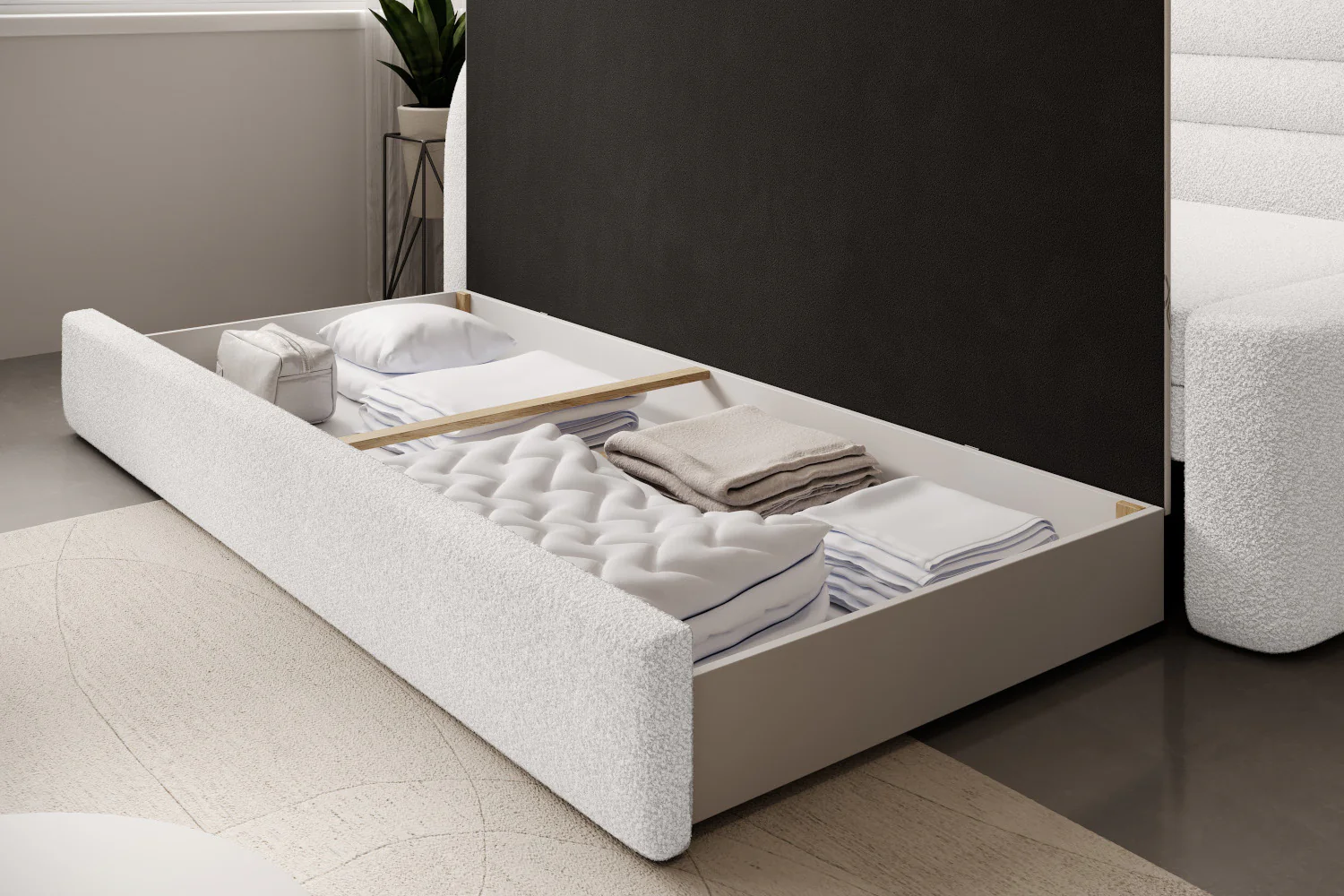 W parze z funkcją spania idzie pojemnik na pościel, który pomieści wszystkie niezbędne tekstylia – kołdry, poduszki, prześcieradła. To doskonałe rozwiązanie, które pozwala utrzymać porządek w mieszkaniu i mieć wszystko pod ręką.