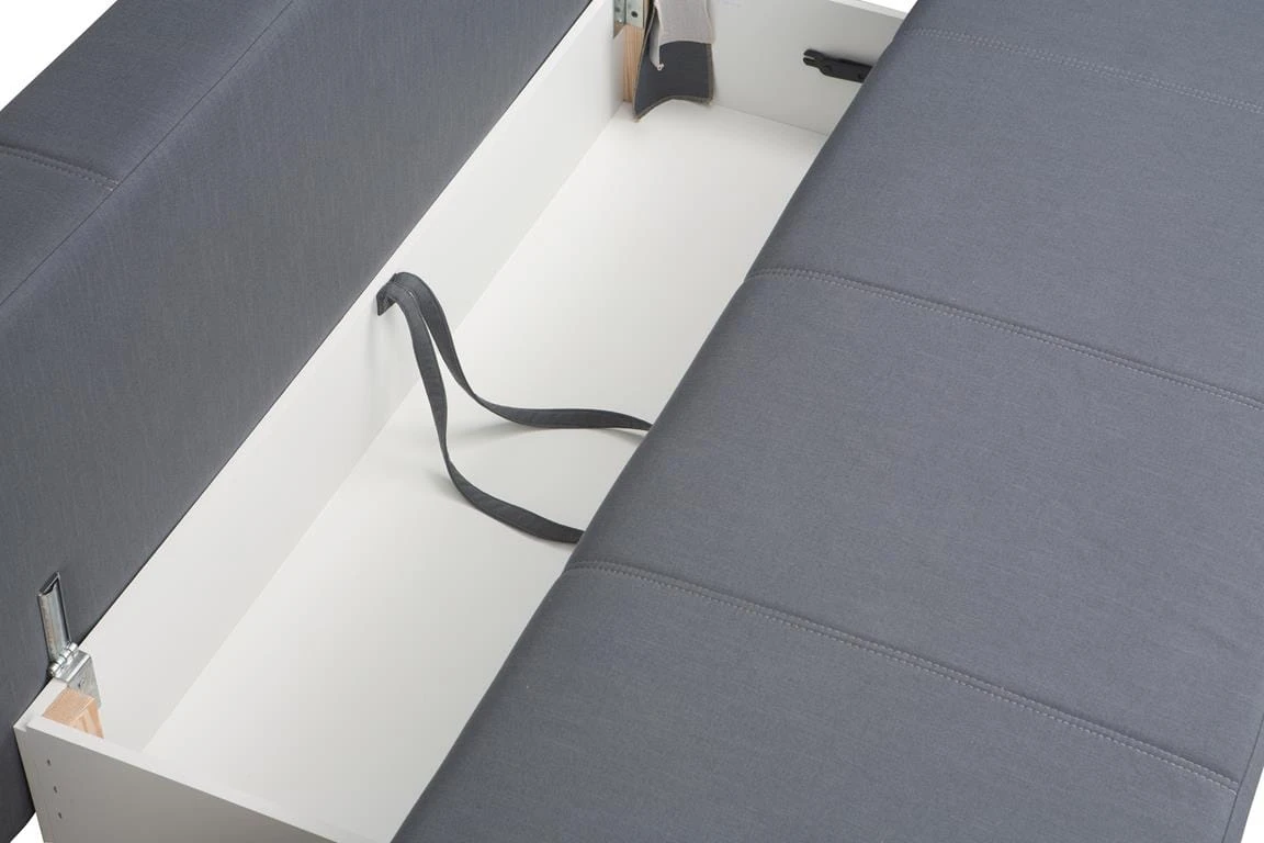 Sofa została wyposażona w pojemnik, w którym możemy przechowywać pościel, koce i drobiazgi.