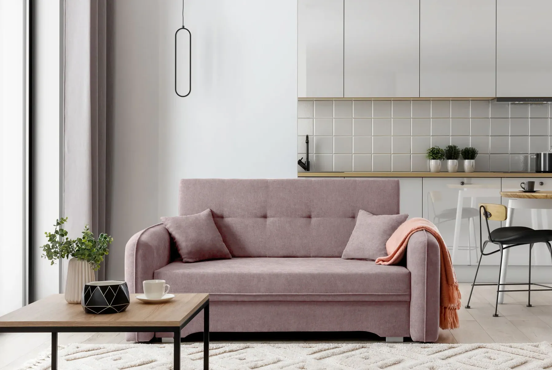 Sofa LAINE Tkanina Poco 101 Różowa 3-Osobowa Pojemnik Funkcja Spania Kanapa Amerykanka