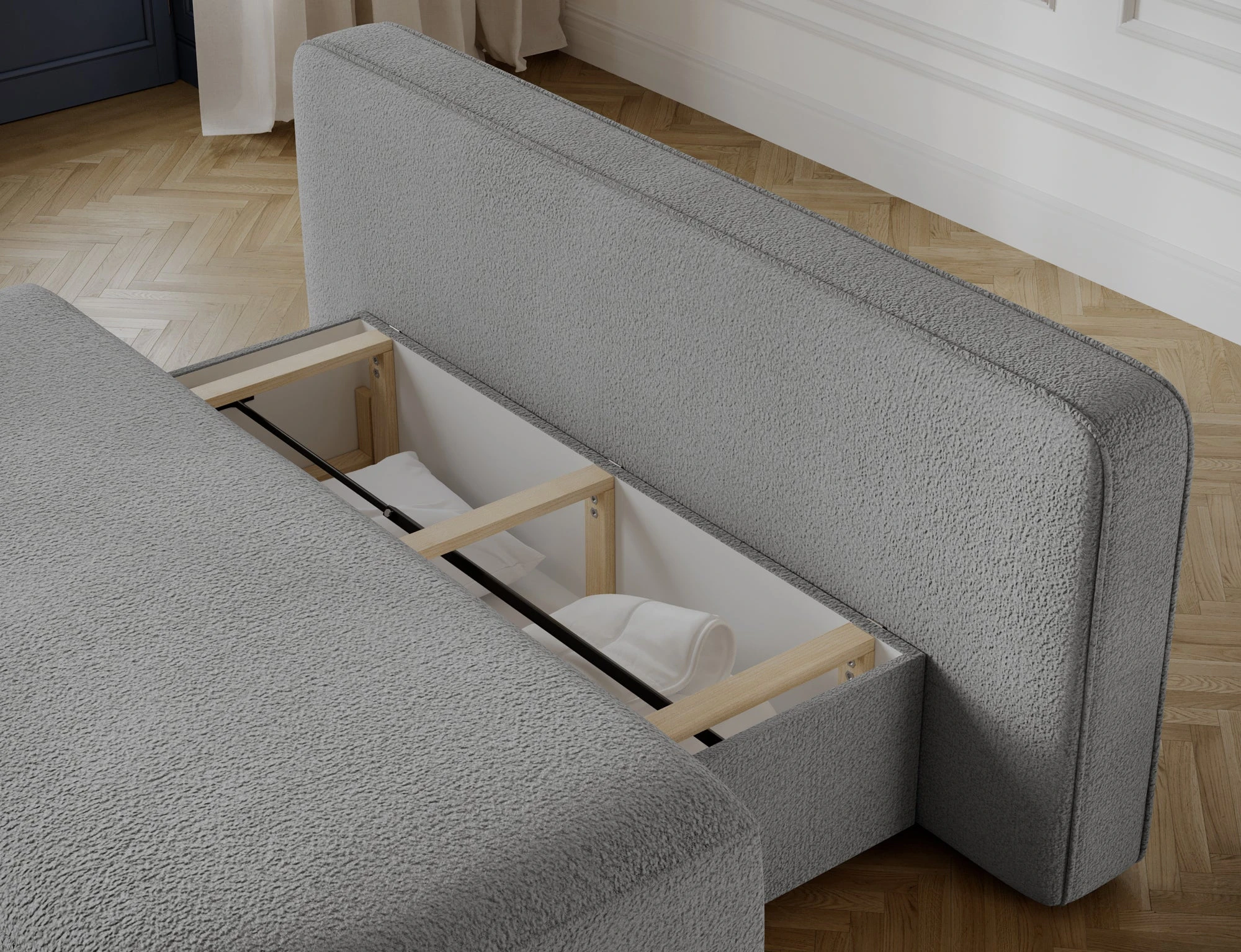 Sofa została wyposażona w sprężynę falistą typu B oraz piankę T2540, co gwarantuje wysoką sprężystość, odporność na odkształcenia oraz pełny komfort podczas codziennego odpoczynku. Mechanizm DL zapewnia szybkie i lekkie rozkładanie – jednym ruchem. Po rozłożeniu sofa tworzy wygodne łóżko o powierzchni 150 × 193 cm i wysokości spania 48 cm. Praktyczny schowek o wymiarach 54 × 147 × 24 cm pozwala przechować poduszki, koce i pościel, pomagając utrzymać porządek w pomieszczeniu.