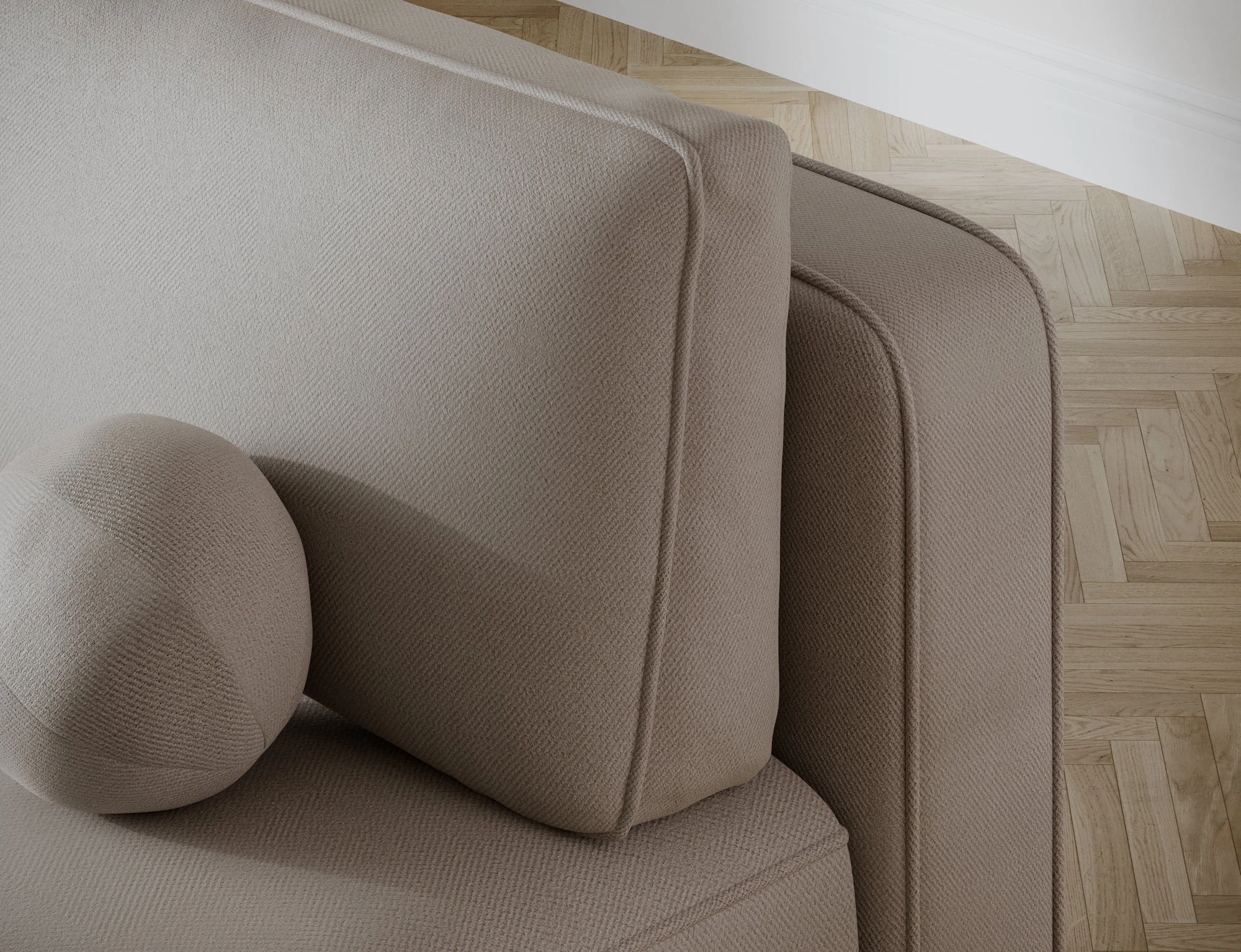Dzięki tapicerowanemu tyłowi, sofa świetnie prezentuje się także ustawiona na środku pokoju. Miękkie linie, zwarte proporcje i niskie czarne nóżki (2,5 cm) podkreślają lekkość i ponadczasową stylistykę mebla.