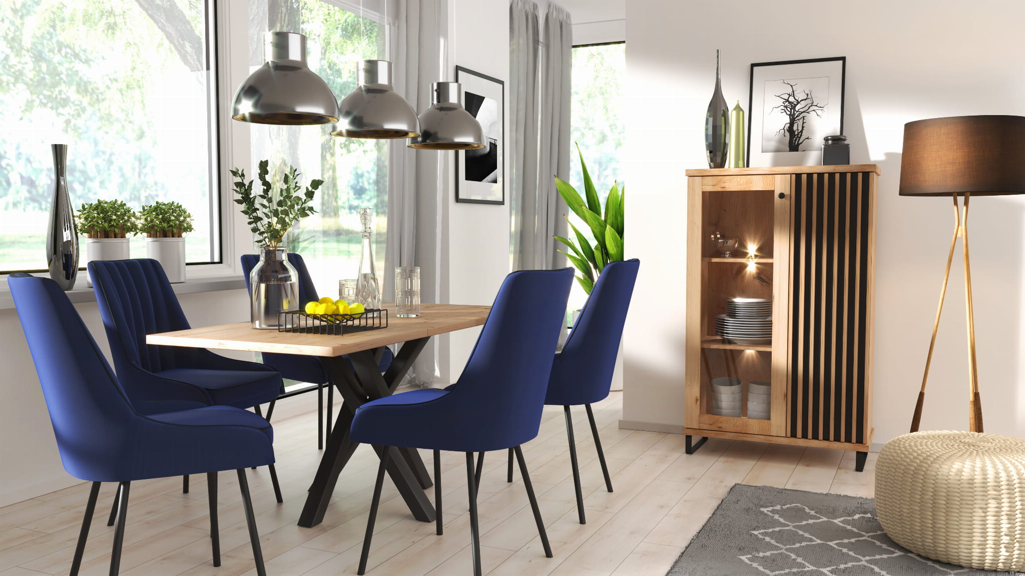 Połączenie jasne, naturalnego koloru artisan z czarnymi, metalowymi nogami to dizajnerski sposób na aranżację jadalni.