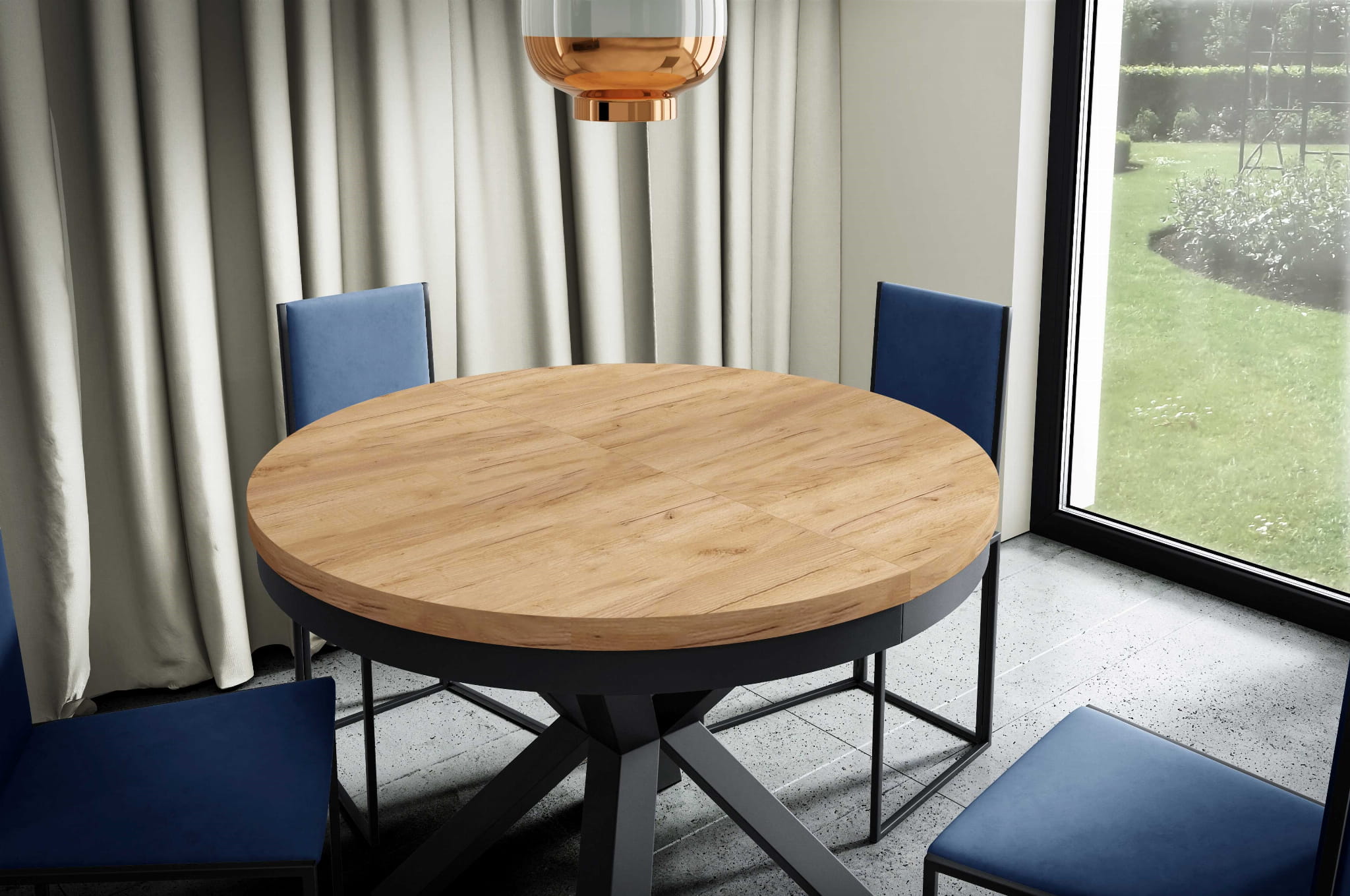 Stół NARWIK 100 - 176 Okrągły Rozkładany Blat Dąb Artisan Nogi Czarne Loft