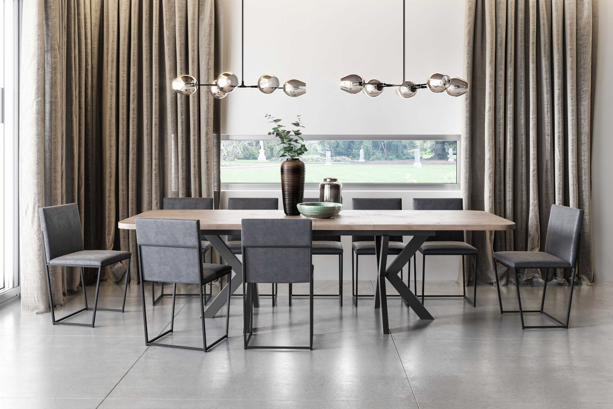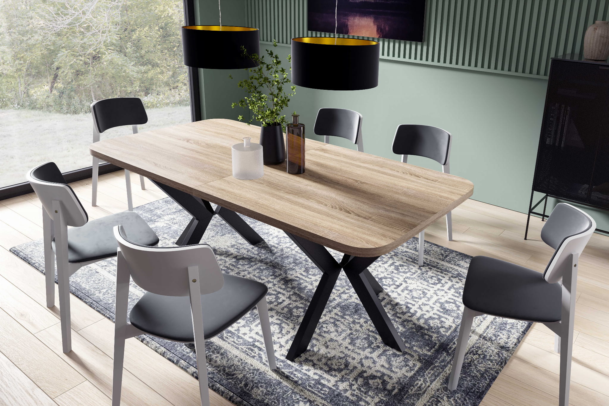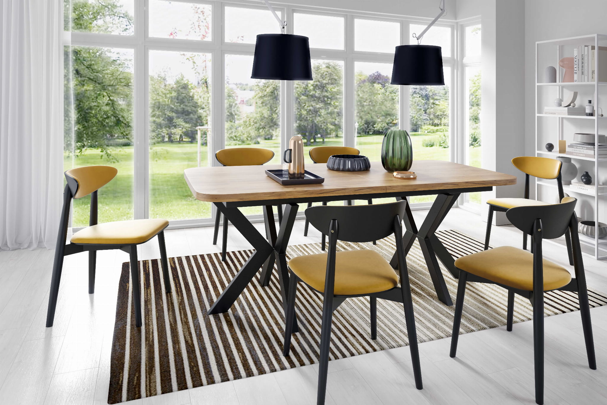 Całość osadzono na oryginalnej, masywnej podstawie stworzonej przez malowane proszkowo, metalowe nóżki, które elegancko współgrają ze sobą. Oslo, to solidny i efektowny stół, który nada wnętrzu charakteru.