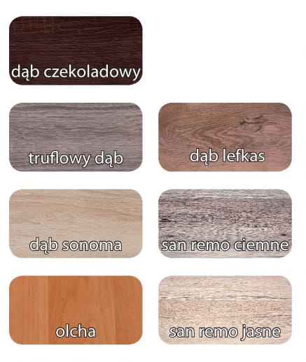 - kolory do wyboru: dąb czekoladowy, dąb sonoma, truflowy dab, olcha, san remo ciemne, san remo jasne, dąb lefkas
