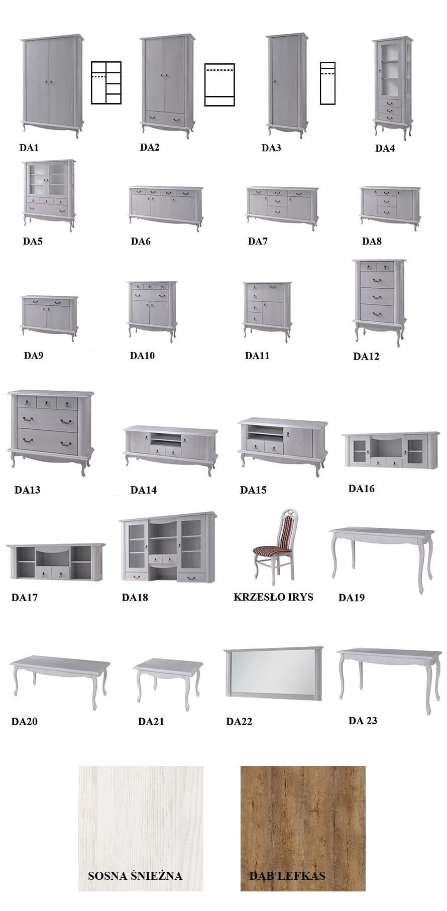 System pokojowy Diana jest dostępny w dwóch kolorach: sosna śnieżna i dąb lefkas. Wyrazista struktura dekoru drewna, naturalne kolory bieli i brązu dodają wnętrzu przytulności i harmonii.