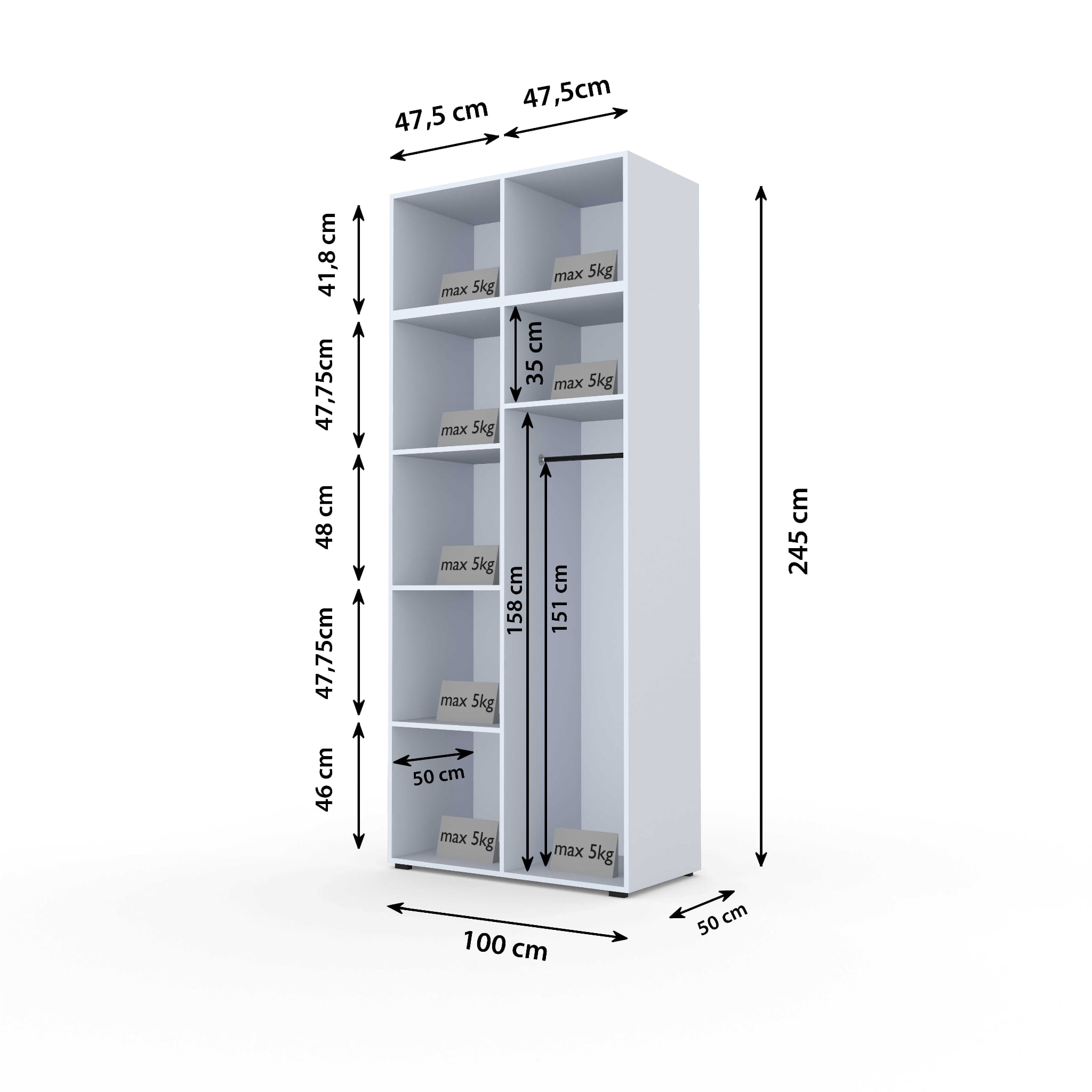 - W zestawie są cztery półki i drążek na ubrania wiszące - możliwość zamontowania z półkami lub drążkiem wg zdjęć