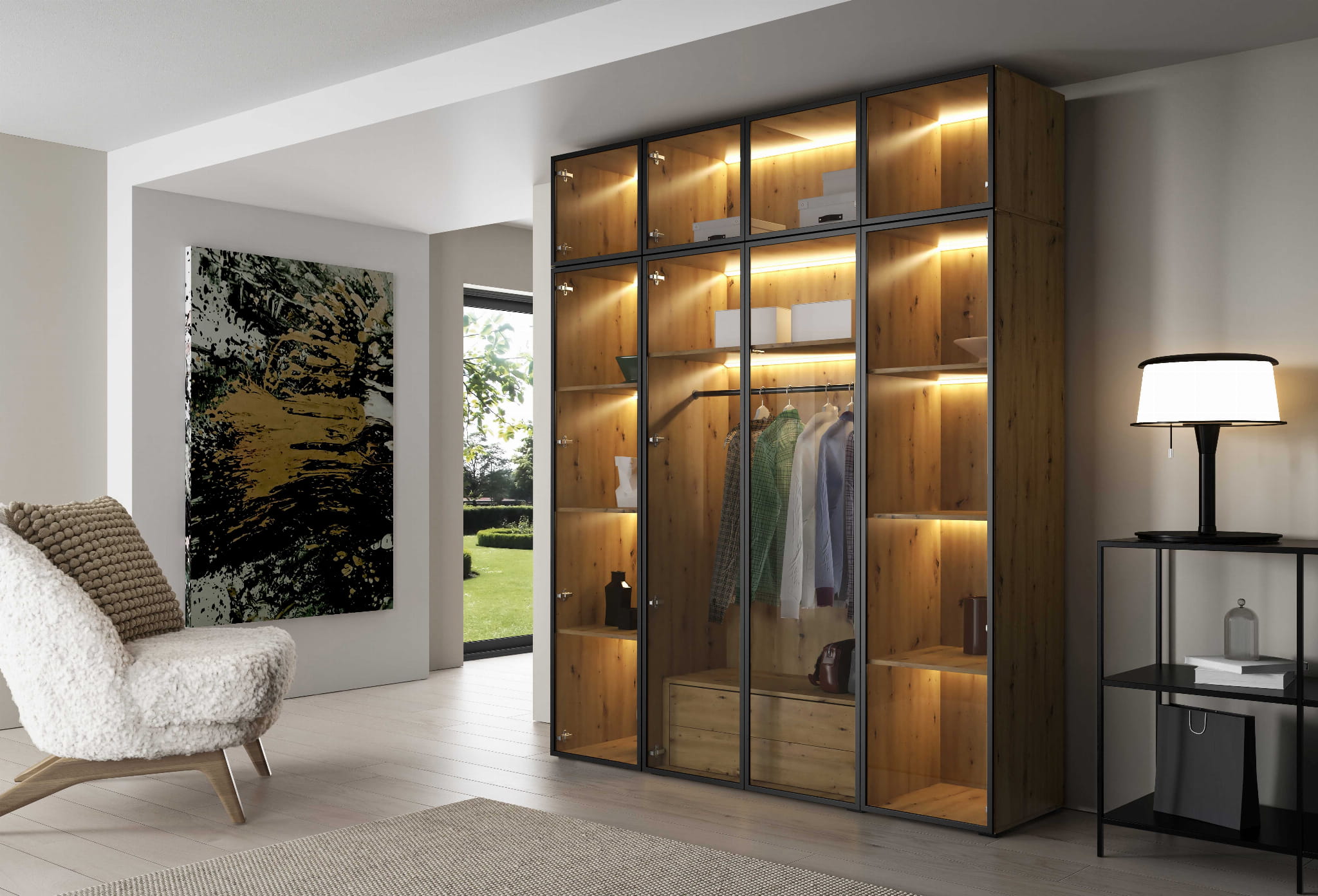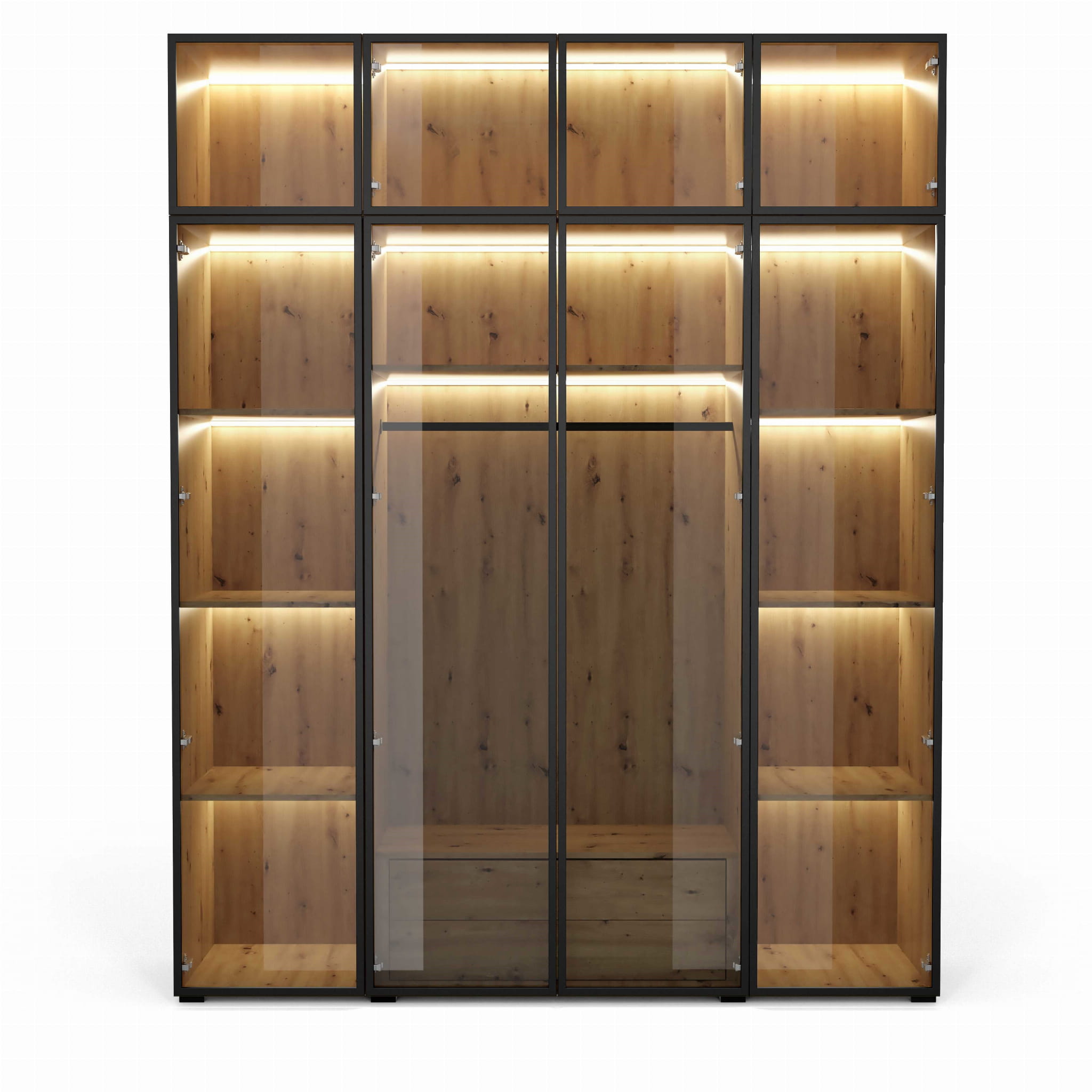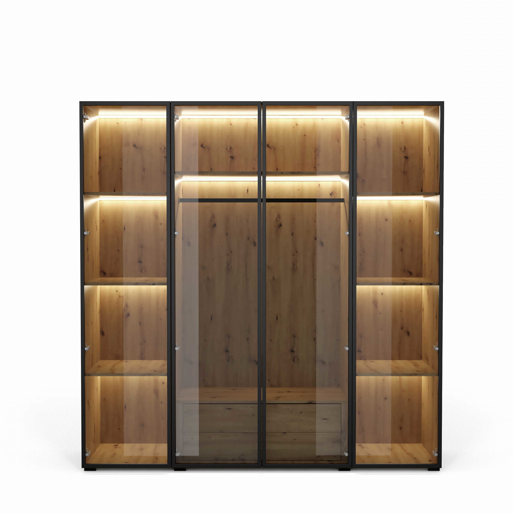 Szafa ALEX Szerokość 200 cm Front Szkło z Czarną Ramką Korpus Dąb Artisan Nowoczesna Modułowa OL200 FSZ