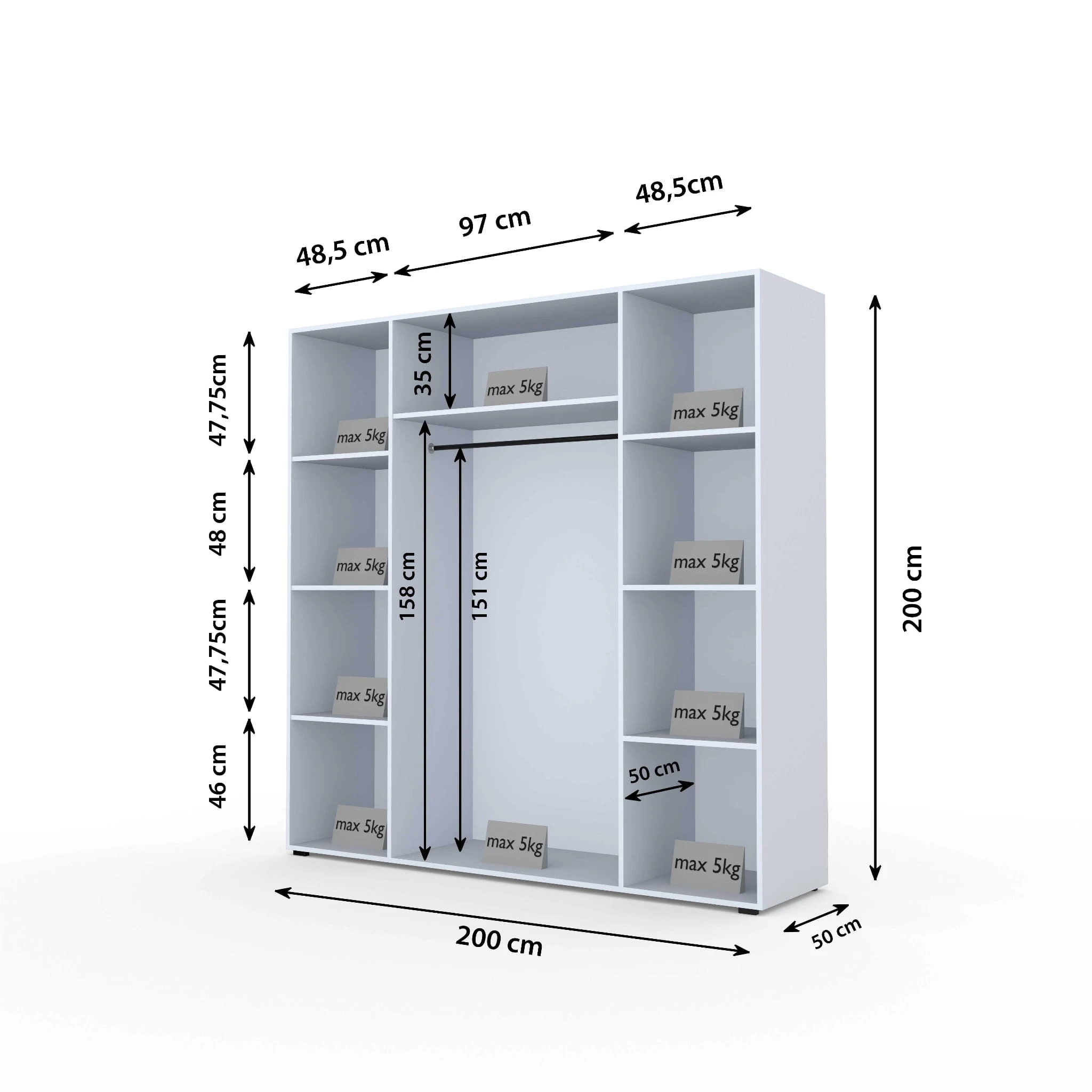 - W zestawie jest siedem półek i dwa drążki na ubrania wiszące - możliwość zamontowania z półkami lub drążkiem wg zdjęć