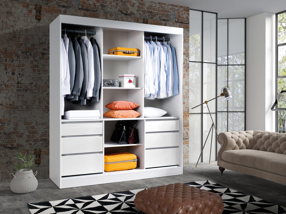 Szafy ubraniowe Haiti posiadają dwudrzwiowe, przesuwne fronty, które otwierają się płynnie i cicho dzięki zastosowaniu wysokiej jakości mechanizmu. Wnętrze szafy składa się z praktycznych półek, szuflad i wieszaków.