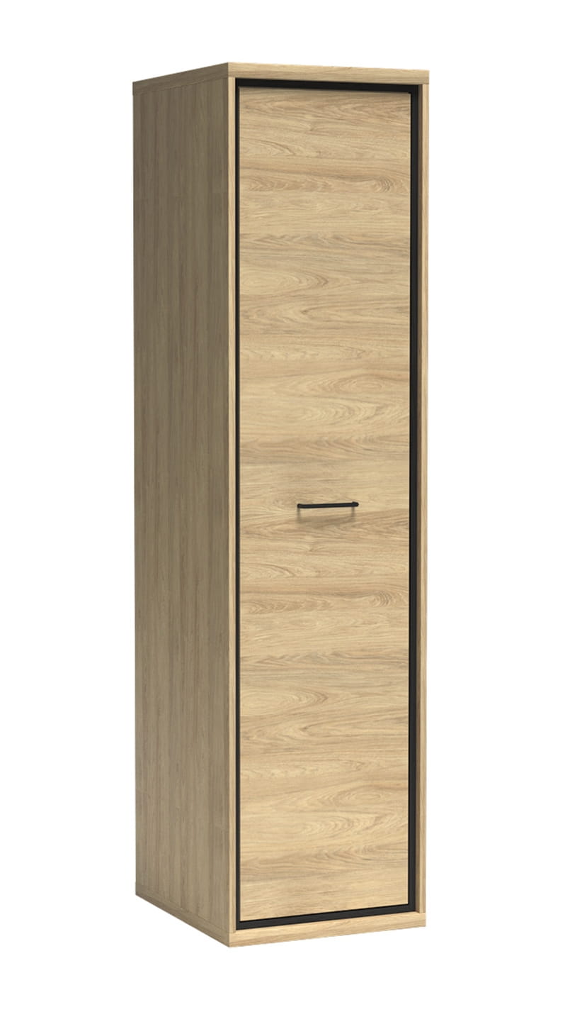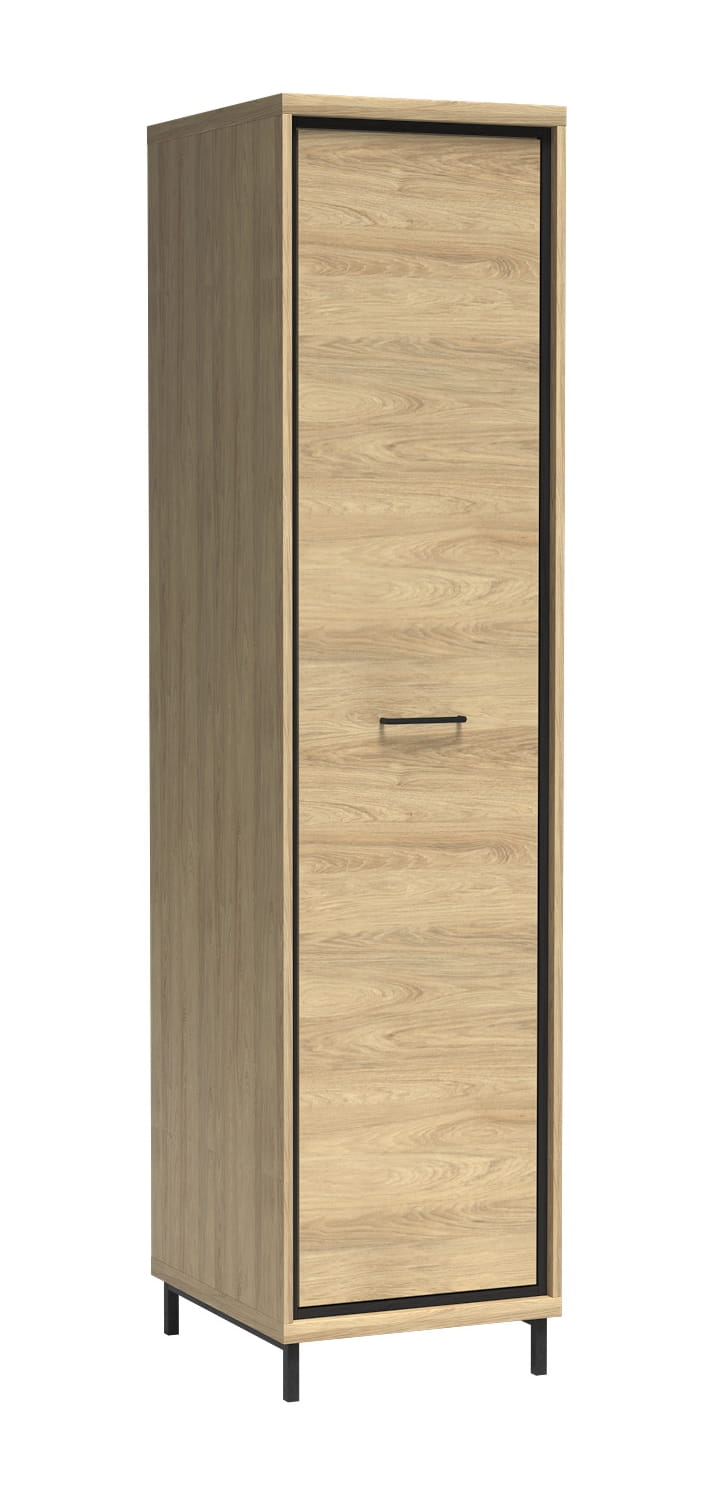 Szafa jak garderoba, na długie suknie, jest idealna do każdego wnętrza, jeśli tylko brakuje Ci przestrzeni. Posiada drążek do wieszania ubrań, a zaraz nad nim umieściliśmy praktyczną półkę na samej górze szafy. Naturalny kolor hikora wraz czarnymi dodatkami wtapia się w każdy wystrój wnętrz, ale najbardziej pasuje do modnego stylu loftowego. Istnieje możliwość dodania półek do środka jako opcja dodatkowa, wówczas szafa stanie się funkcjonalna i prosta.