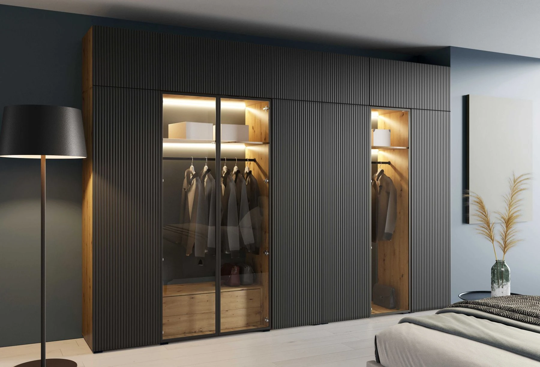 Szafa modułowa ALEX 350 cm – Czarny ryflowany front i lekkość szkła